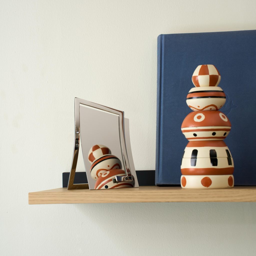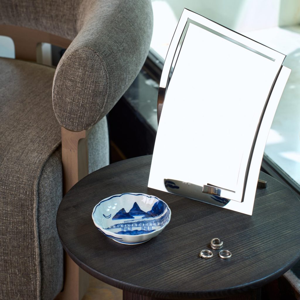 The Qua mirror reconsiders reflection by replacing glass with polished stainless steel. This shift introduces durability while maintaining clarity, transforming the mirror into an object that resists fragility.