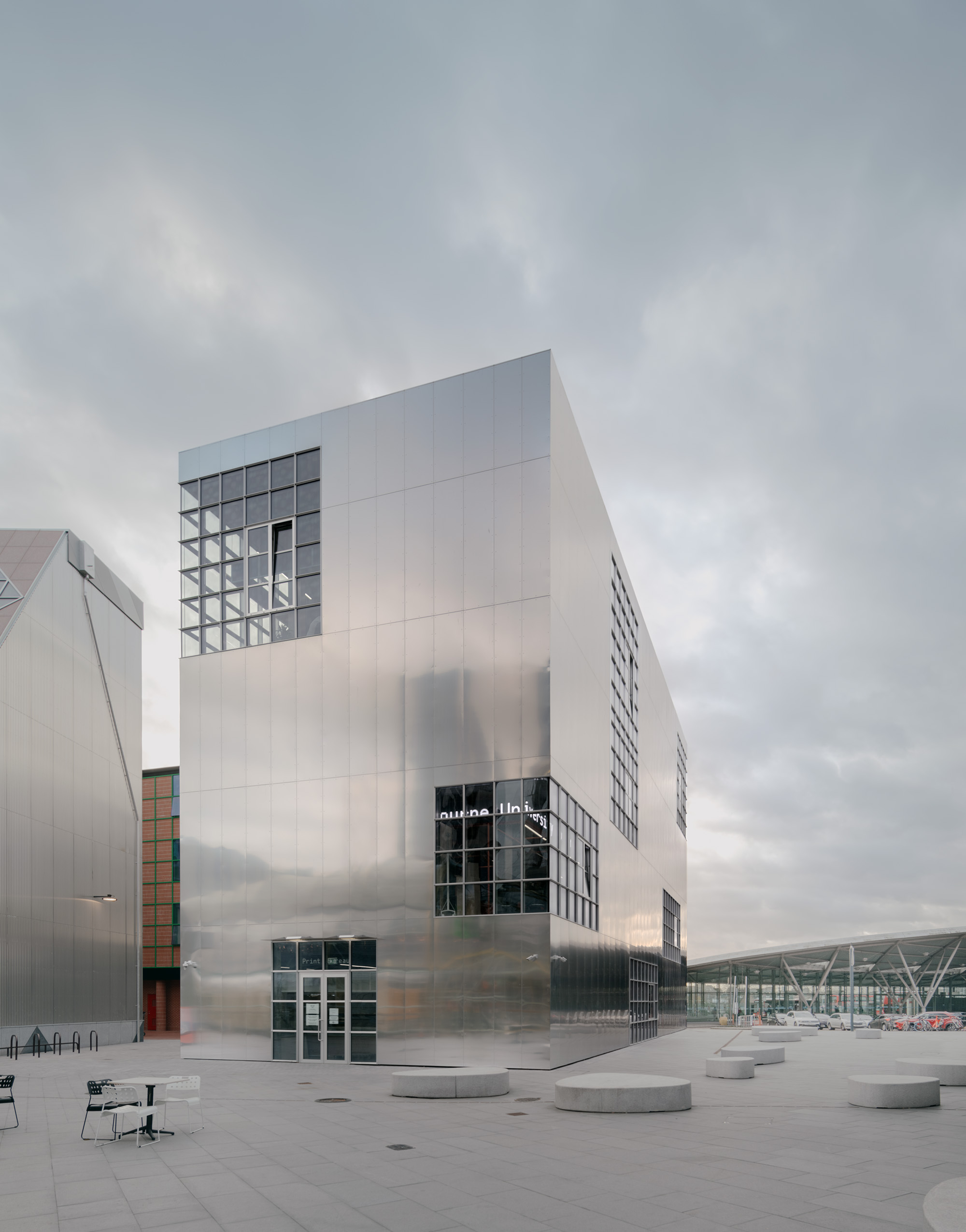 The reflective materiality is not a flourish, it is a method of belonging. In a setting where the broader urban context is still evolving, the mirror finish allows the building to dissolve into what surrounds it, even as that surround is incomplete. Light and colour become the project’s changing façade, shifting with the day, the weather, and the seasons. The ateliers participate in the life of the Design District by absorbing its atmosphere, turning the neighbourhood into a constantly updated surface.