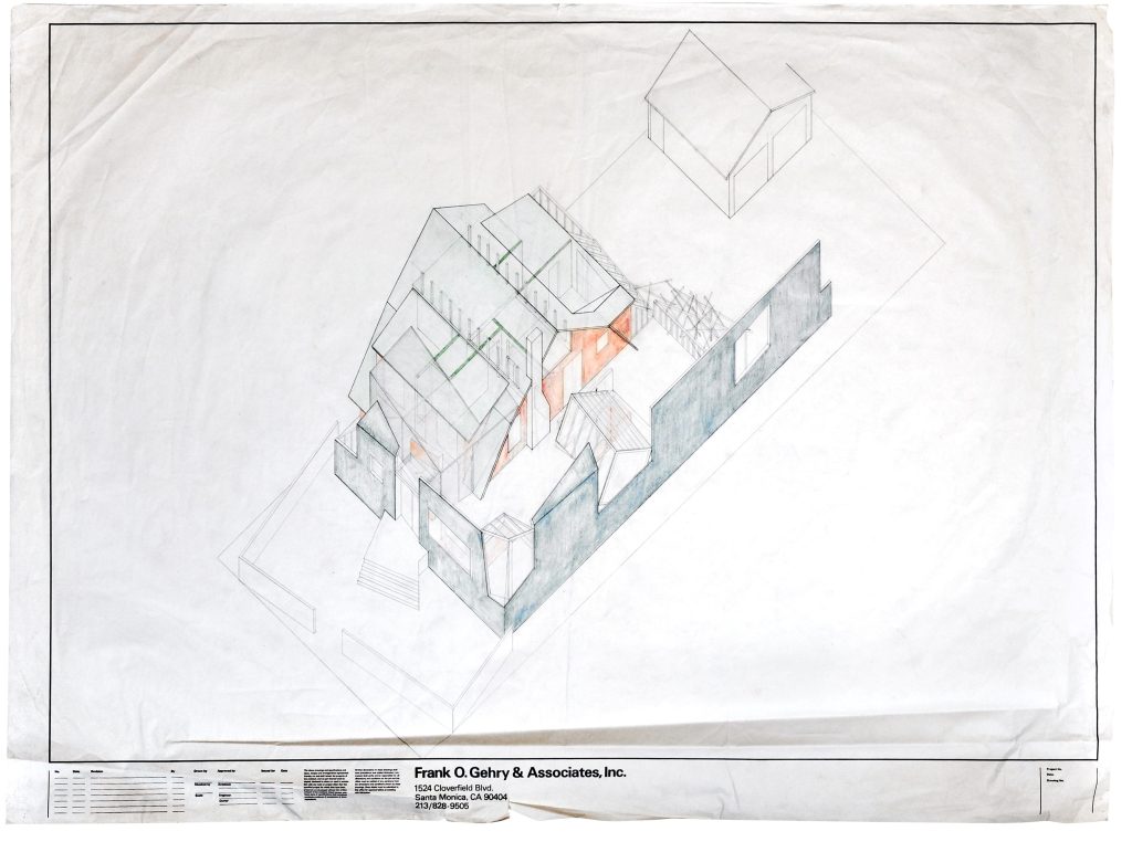 The first catalogue’s endpoint is the Santa Monica house Gehry remodelled for himself and his wife, Berta, in 1978, documented through drawings, sketches, and images. The circumstances were direct. Berta found the house, Gehry’s mother encouraged the purchase, they had two young children, and the budget was limited. The kitchen was inadequate and another bedroom was needed, so the work had to proceed quickly.