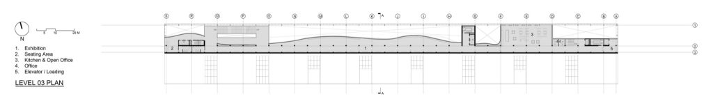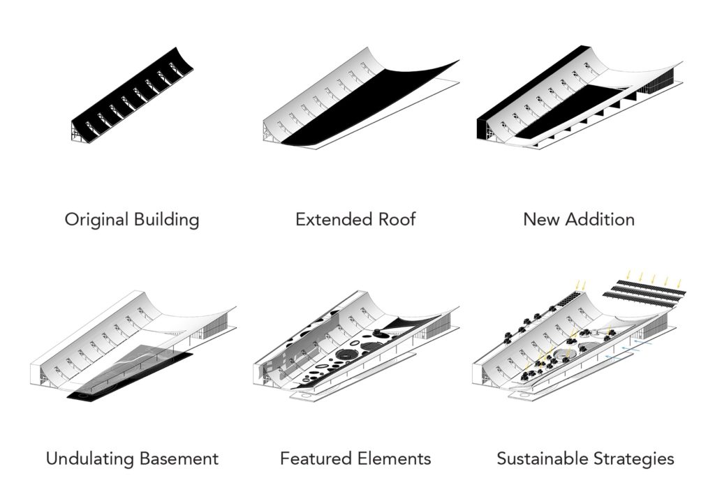 Environmental strategy is integrated through the project’s first principle, reuse. By retaining the existing structure and limiting new construction, the proposal reduces material demand while preserving embodied value. The extended canopy contributes passive shading and helps moderate microclimatic conditions along the waterfront. Courtyards and roof openings introduce natural light deeper into the interior, while ventilation strategies take advantage of coastal air movement to support comfort and operational efficiency.