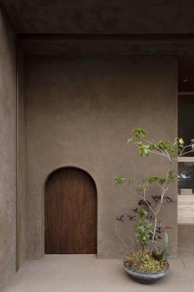 The exterior is finished in earth, applied by skilled plaster craftsmen, giving the small façade a grounded, almost geological calm amid the commercial noise of the street. Inside, solid chestnut wood brings warmth and density, while handcrafted Kurotani washi paper by Hatanowataru softens light and adds a fine grain of texture. Together, the palette balances restraint with richness, creating a takeout bakery interior that feels intimate without becoming precious.