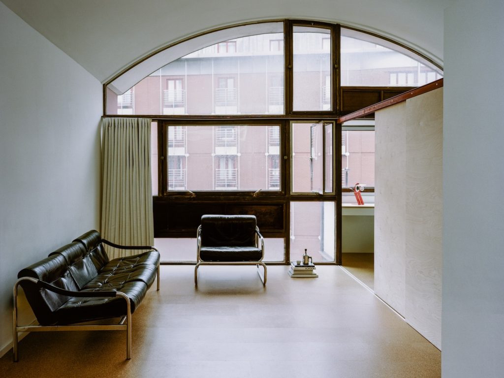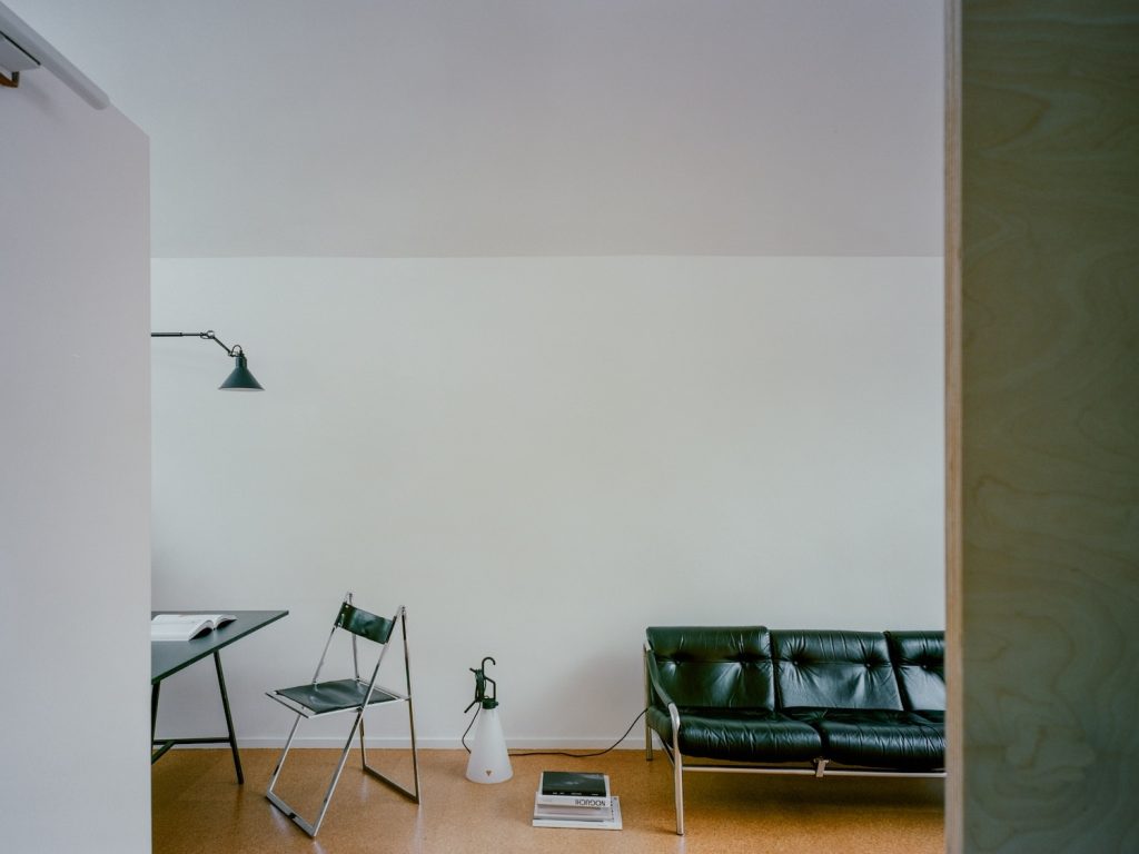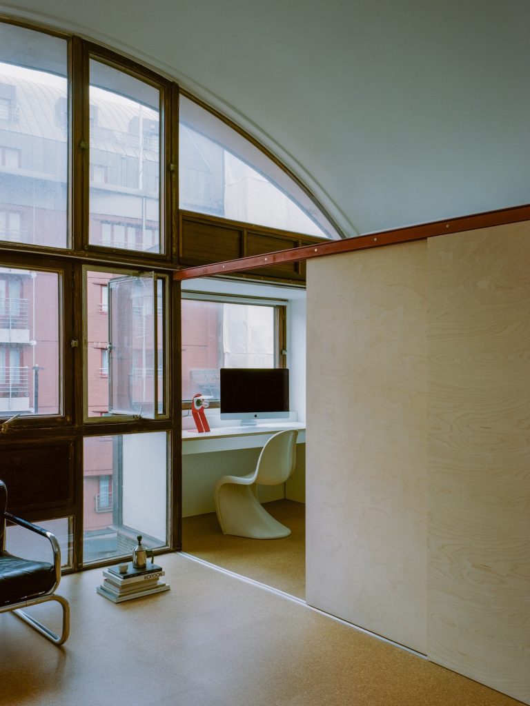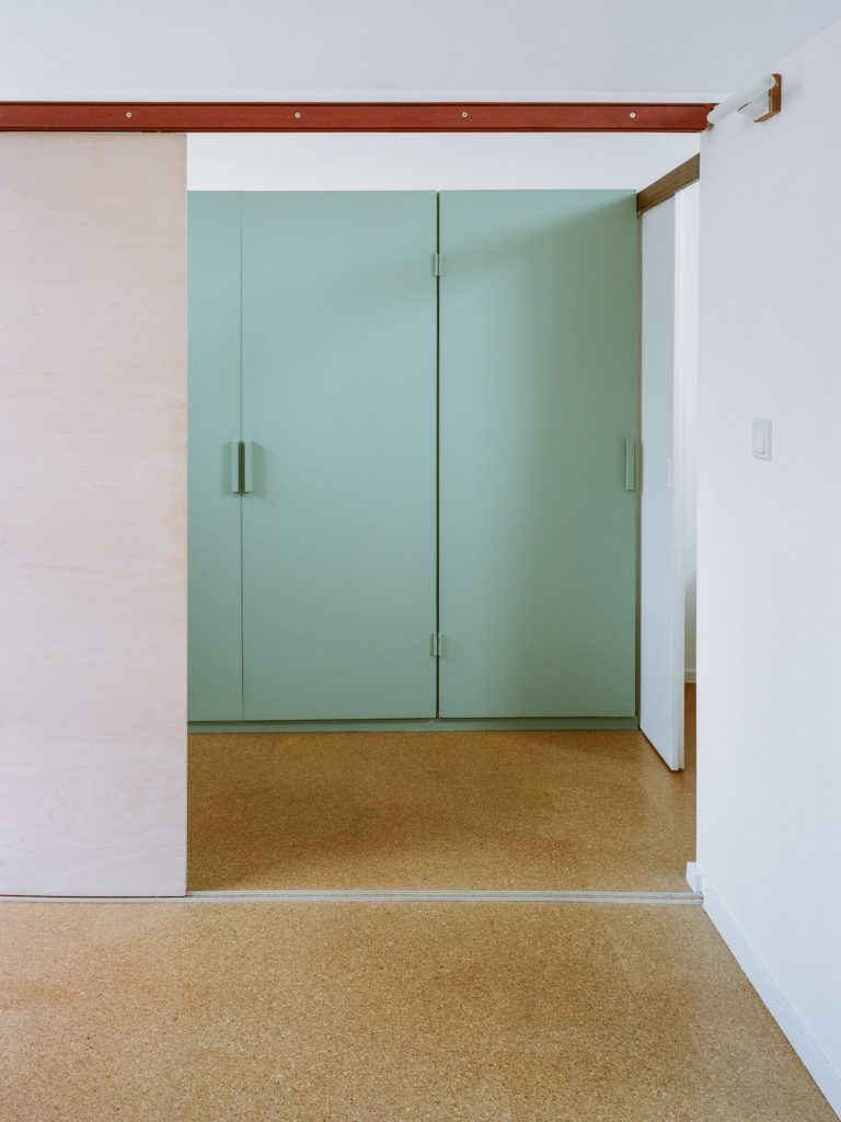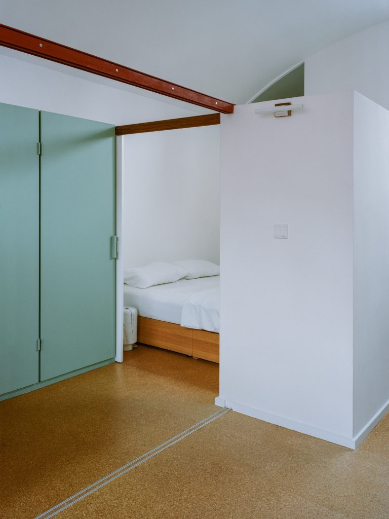 The first impression is sensory. Cork flooring brings warmth without softening the architecture’s clarity, offering natural insulation, durability, and a quieter acoustic atmosphere. Against the apartment’s concrete vaults, the cork reads as a deliberate counterpoint: tactile and domestic, yet visually restrained enough to sit comfortably within a modernist language.