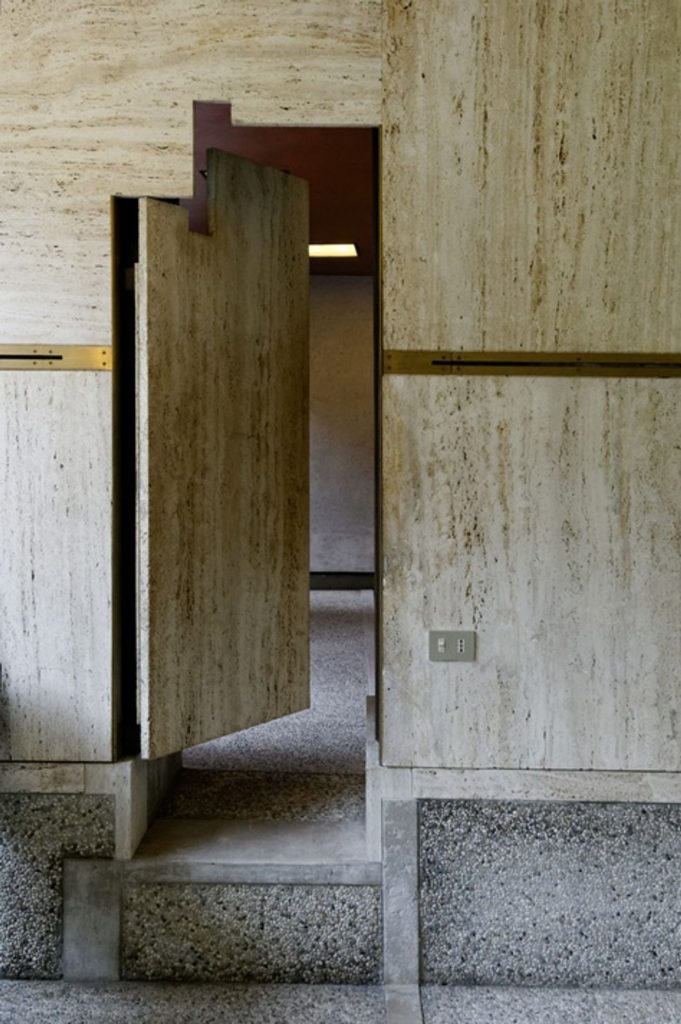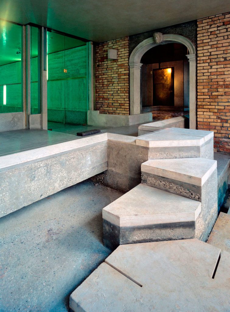 Stone carries weight and continuity. Brass records touch and oxidation. Concrete reveals time through surface. Wood and cork absorb sound and soften movement. Materials are allowed to age. Use is not concealed. At Querini, material choice reinforces conceptual intent. Flooding does not erase surfaces. It marks them. Architecture registers environmental conditions rather than denying them. Scarpa’s joints are not ornamental. They are declarative. They assert that construction is a form of knowledge. Precision becomes a measure of respect.