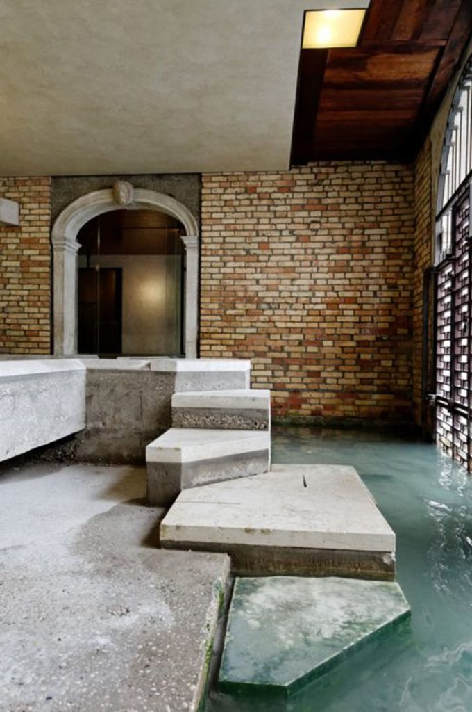 The sixteenth century palazzo, later transformed into a public institution, occupies a ground floor historically exposed to flooding. Scarpa does not defend the interior from acqua alta. He reorganizes the threshold so that water enters as a measured presence. Brass channels guide its movement. Stone surfaces register reflection and rhythm. Flooding becomes legible rather than destructive.