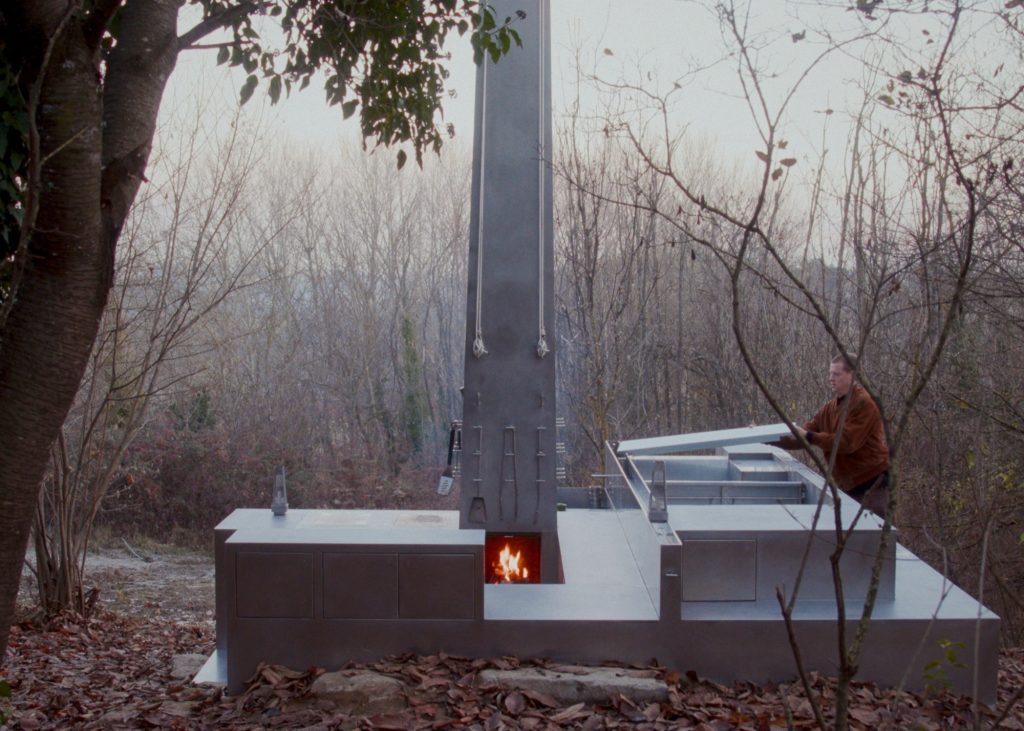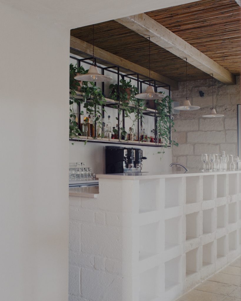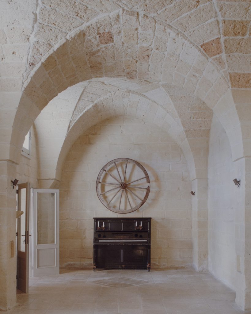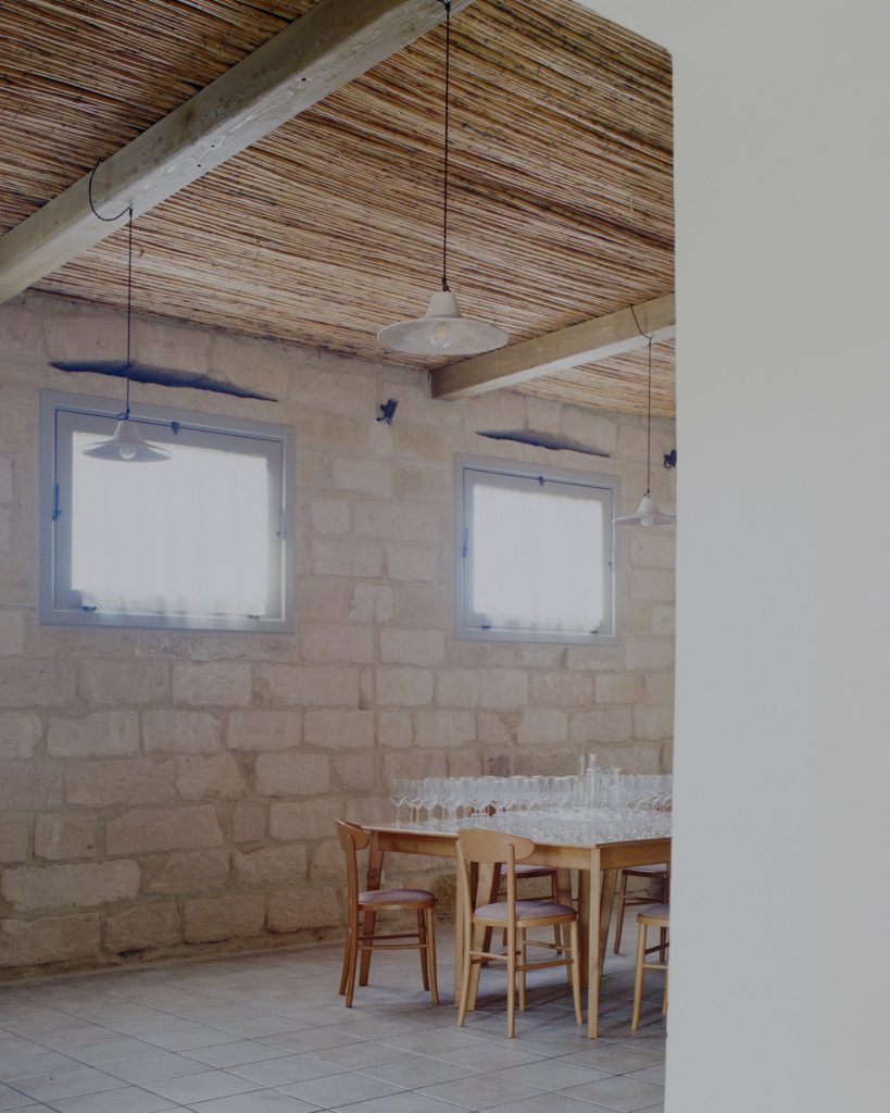 The courtyard is partially sheltered by a lightweight Corten steel structure with reed cladding, providing shade while maintaining openness. Furniture and secondary elements are made from steel, stone, and wood, following a restrained material palette. The project operates through subtraction and precise additions, preserving the original spatial qualities of the masseria while enabling its contemporary use.