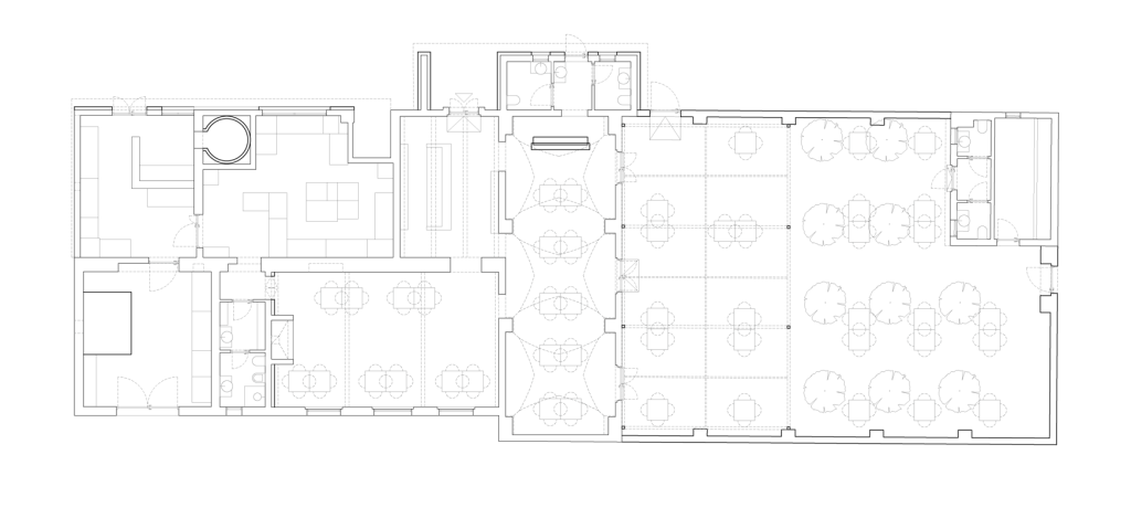 New functions are introduced through a limited number of insertions. A counter, a fireplace, and a partition are added to organise the program without modifying the existing layout. Built in tuff stone and finished with limewash, these elements are clearly distinguishable from the original fabric while remaining materially coherent. The counter integrates reception and service functions, the fireplace defines one of the main rooms, and the partition separates service areas from the vaulted spaces.