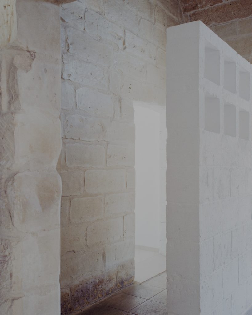 The masseria is organised around a square courtyard enclosed by Lecce stone walls, with a sequence of vaulted rooms forming the main built volume. Over time, multiple additions altered this configuration, including service blocks, reconstructed attics, and a continuous roof covering the courtyard. These interventions disrupted both the spatial clarity and the material consistency of the complex.