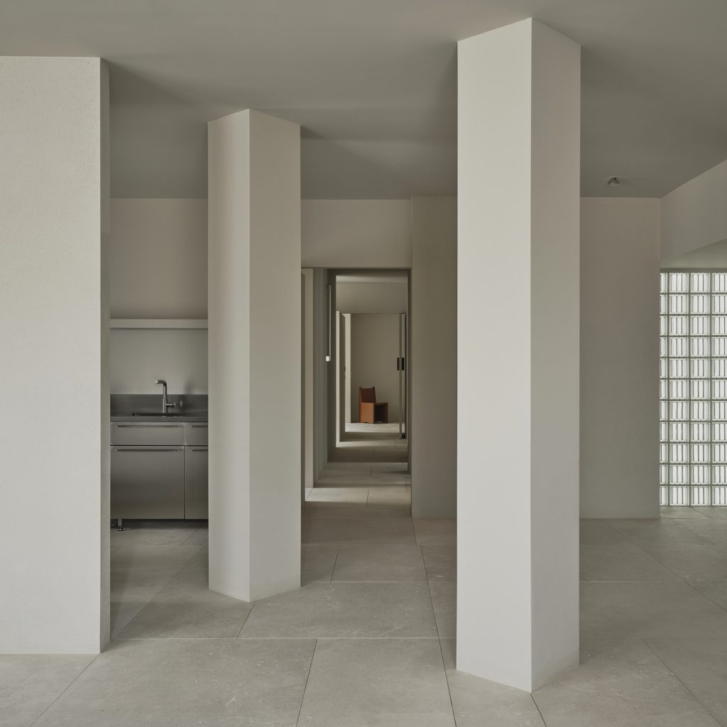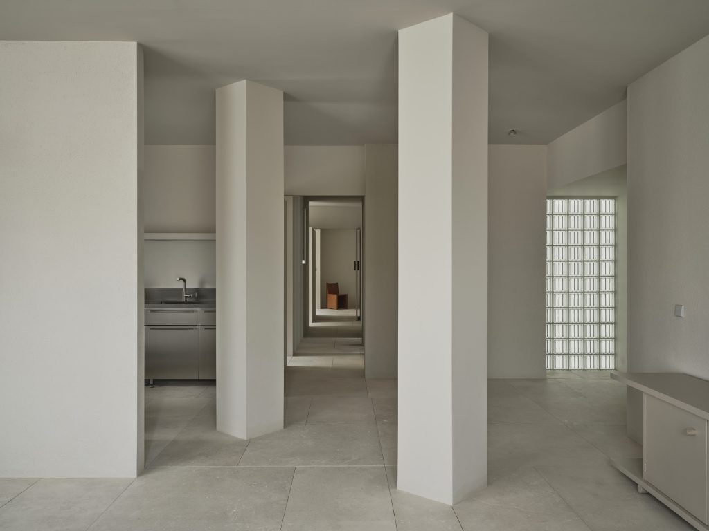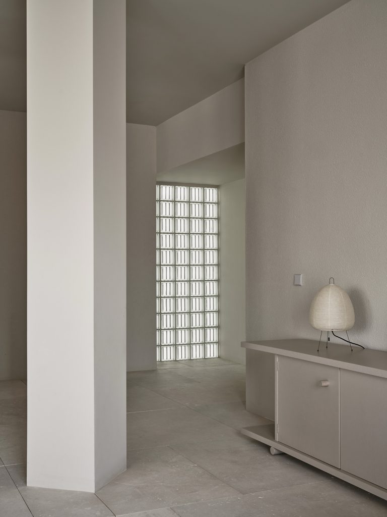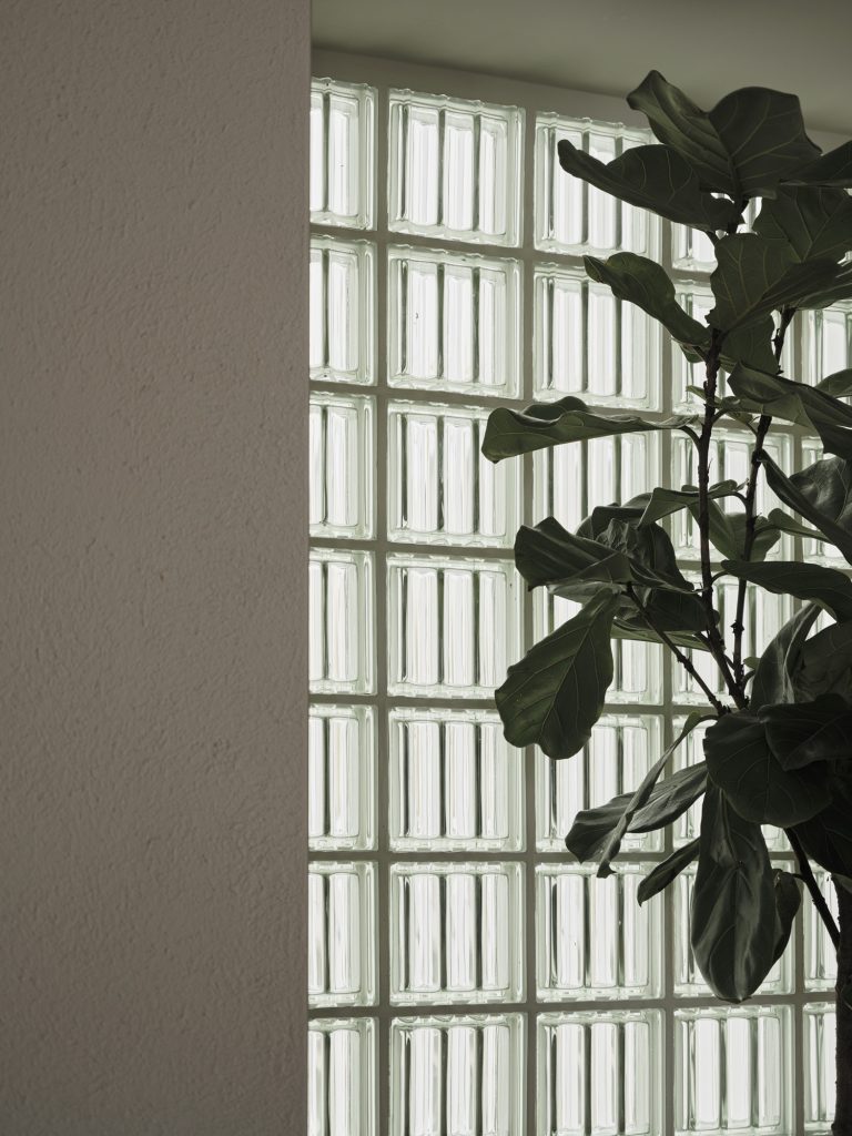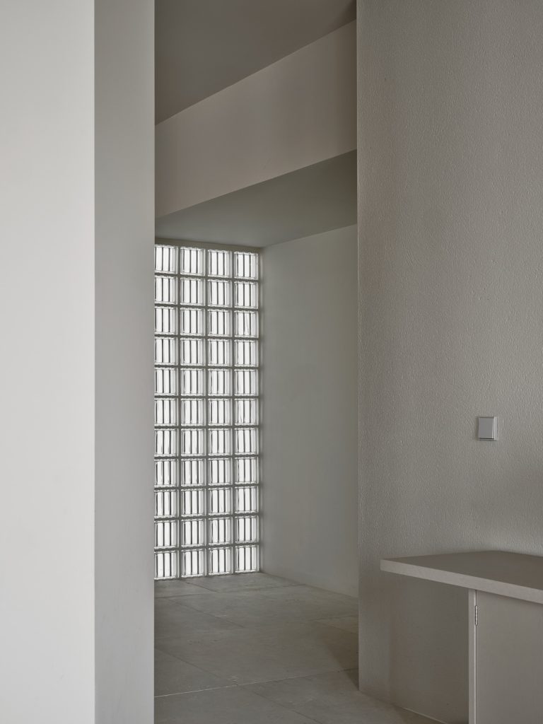 The corridor approaches the adjacent rooms and participates in them, acting less as a passage and more as a structural backbone. Bold volumes along this axis define the domestic rhythm of the interior while allowing different spatial scales to unfold gradually. The sequence is punctuated by carefully placed glass block screens that diffuse incoming daylight. These translucent surfaces soften the solidity of the walls while introducing a tactile layer that enhances visual continuity across the plan.