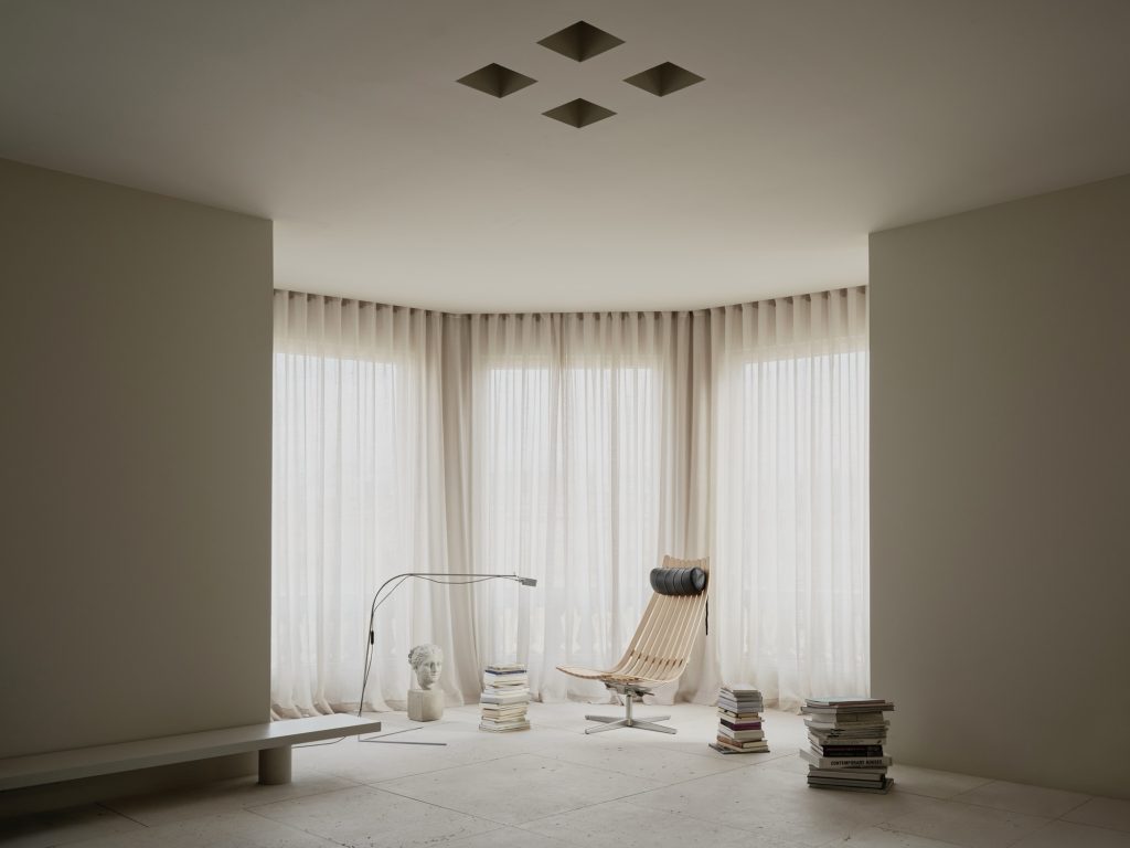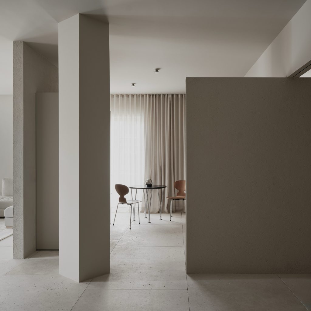The elevated position of the apartment offers generous sunlight throughout the day, and the design transforms this condition into the driving force of the project. Light is not merely admitted into the space; it is structured, filtered, and reflected so that it becomes the primary agent shaping the atmosphere of the home.