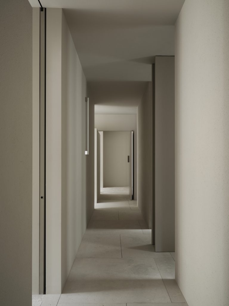 The organization of Casa Kendo is defined by a spatial sequence that prioritizes clarity and continuity. At the center of this strategy is a reconsidered hallway, traditionally treated as a narrow transitional space within domestic layouts. Here it is expanded and thickened, becoming an active architectural element that organizes the life of the apartment.