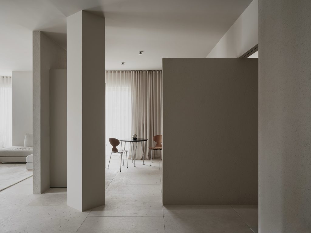 This choice produces an intentionally atonal environment that allows light to become the dominant presence in the space. The textured stone absorbs the strong daylight entering from the seventh floor while gently reflecting it back into the interior. During the late afternoon, when sunlight moves across the surface, the material acquires a warmer and more intimate depth, reinforcing the contemplative atmosphere of the home.