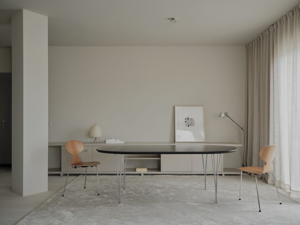 Within this restrained architectural setting, the interior design introduces a curated selection of furniture that complements the sobriety of the stone surfaces. Iconic pieces by Fritz Hansen, including the Ant chairs and the dining table designed by Bruno Mathsson, Arne Jacobsen, and Piet Hein, appear alongside the Scandia Easy Chair by Hans Brattrud for Fjordfiesta.