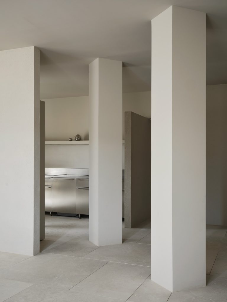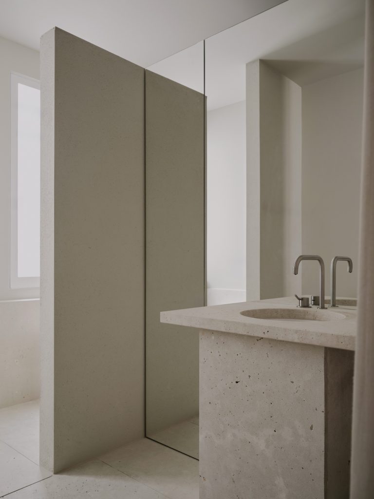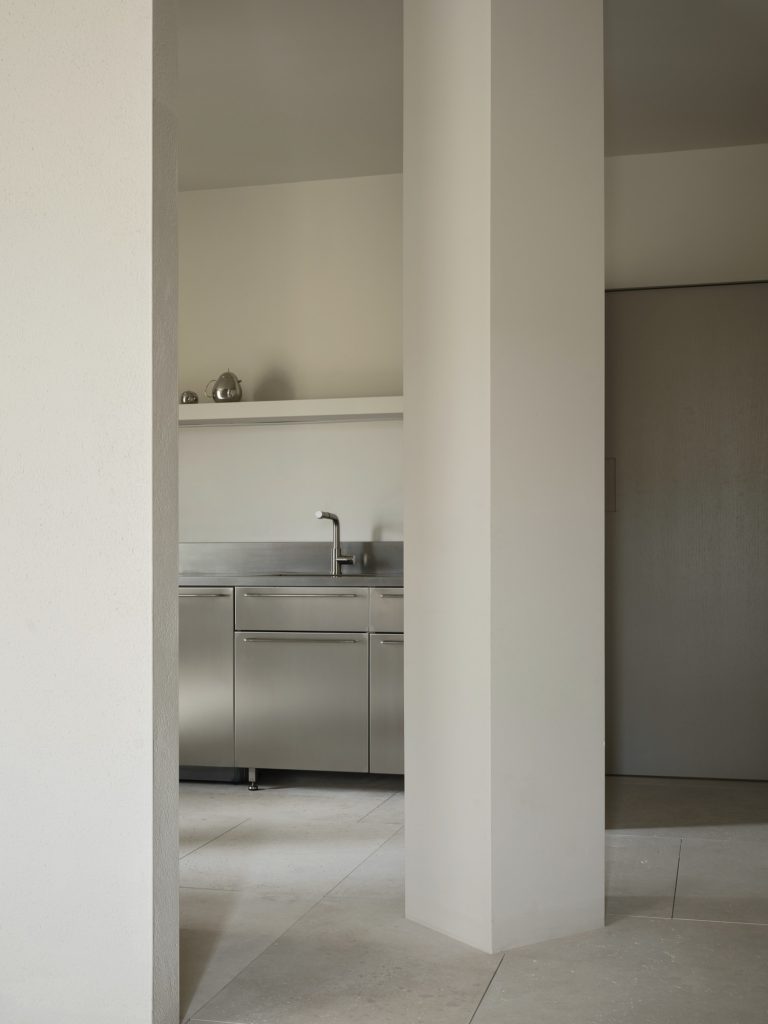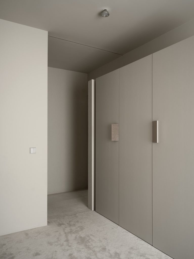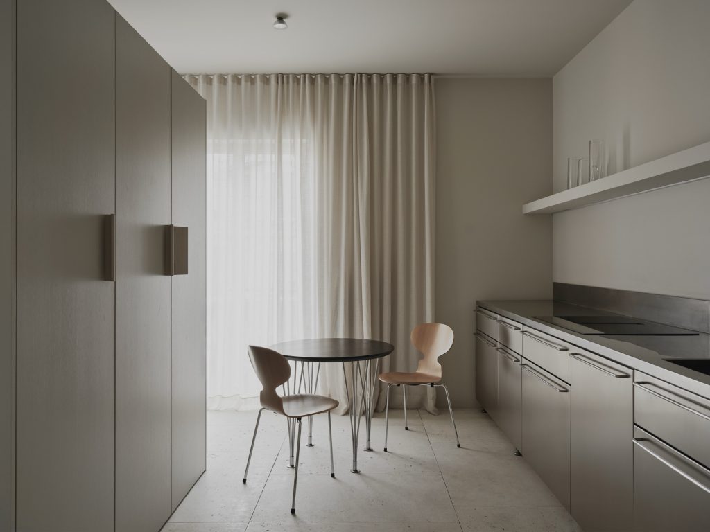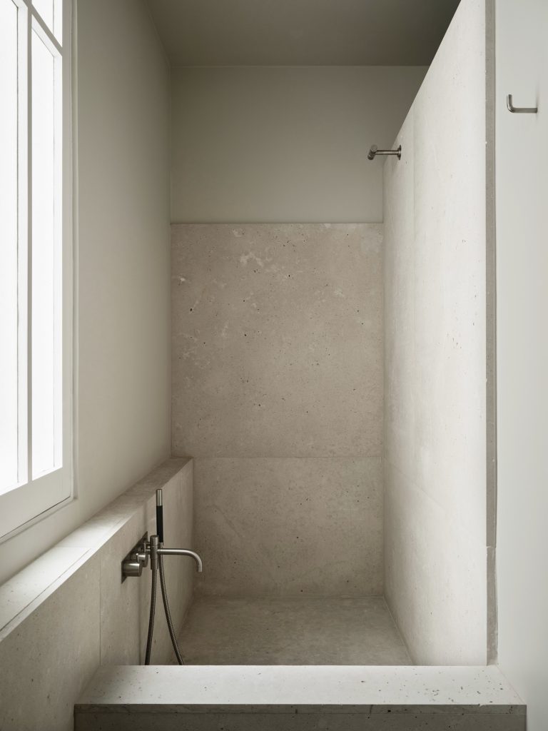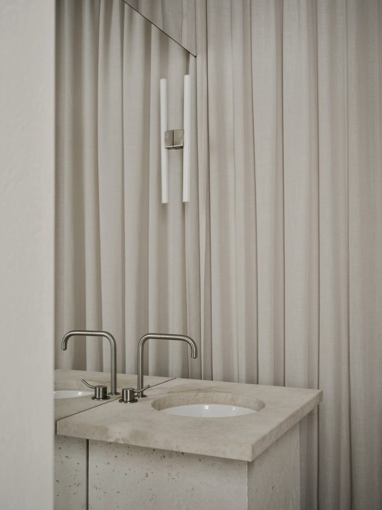 Technical lighting and fixtures by Vola complete the interior, supporting the calm, everyday functionality of the space while maintaining the overall material and visual consistency.
