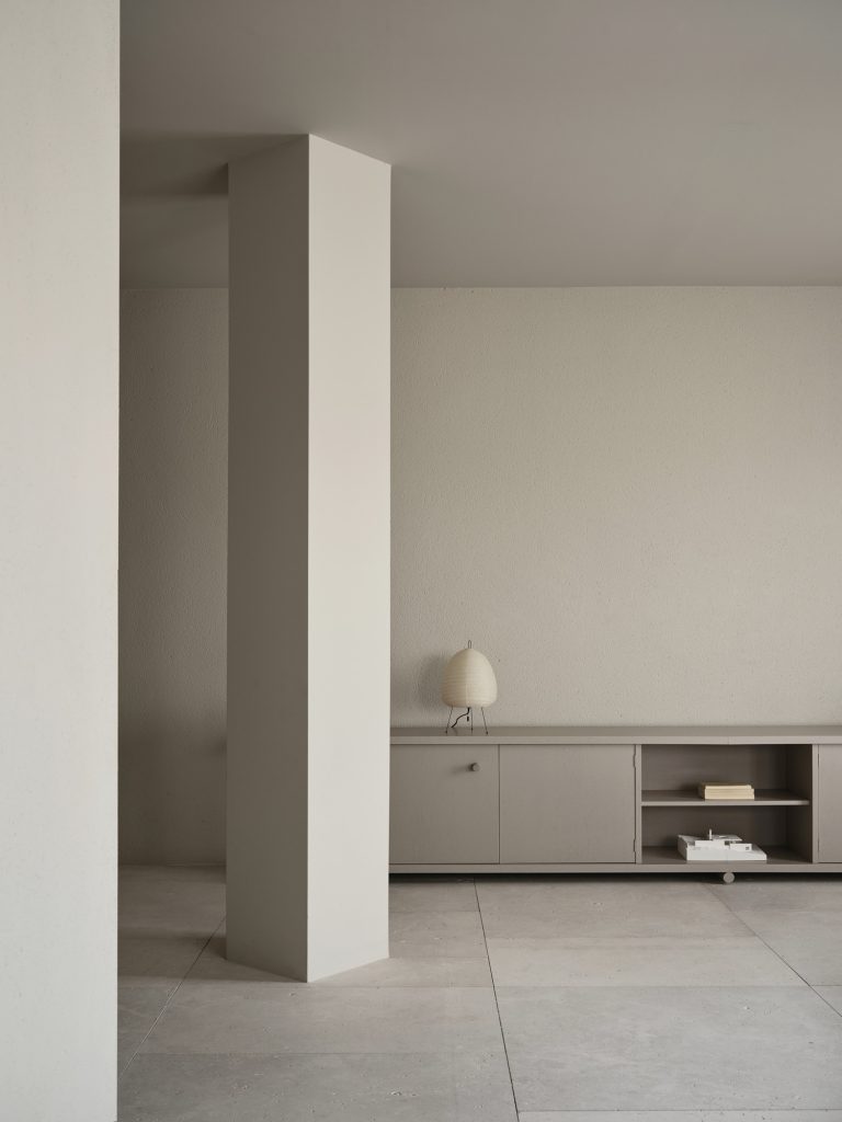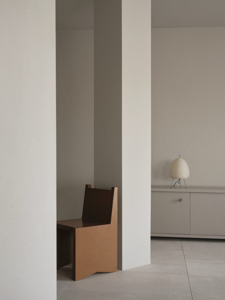 Lighting also contributes to the project’s quiet character. The Flamingo lamp designed by Álvaro Siza for Bd Barcelona and the Akari lamp by Vitra add sculptural light sources that echo the architectural emphasis on softness and atmosphere. Custom elements designed by the studio itself, such as the Tarugo Chair, integrate seamlessly into the composition and reinforce the project’s sense of coherence.