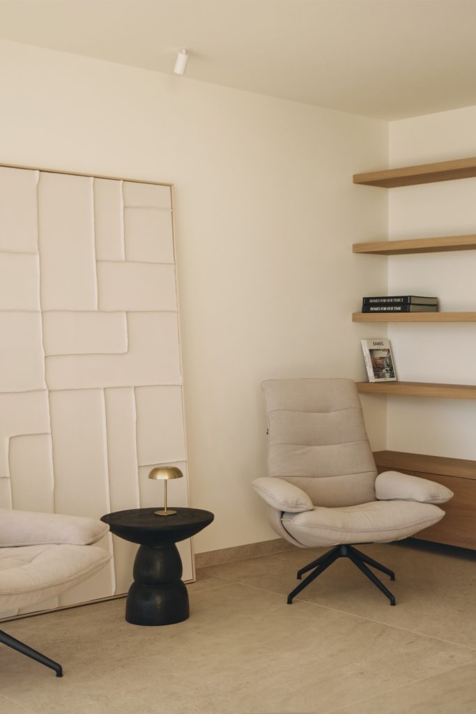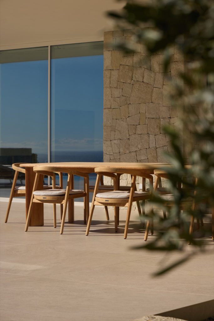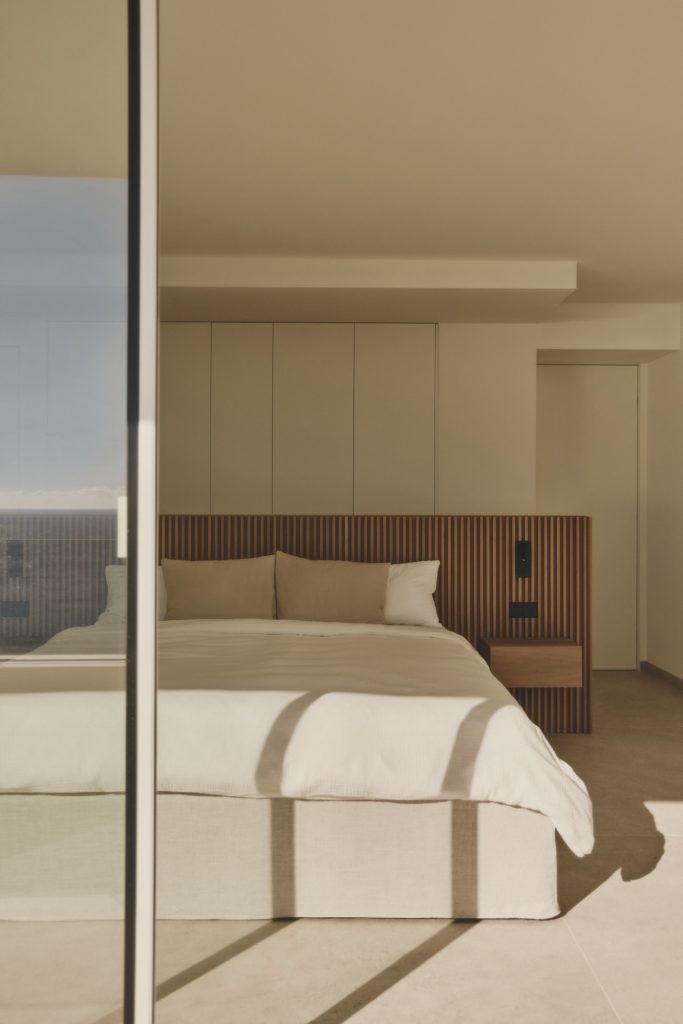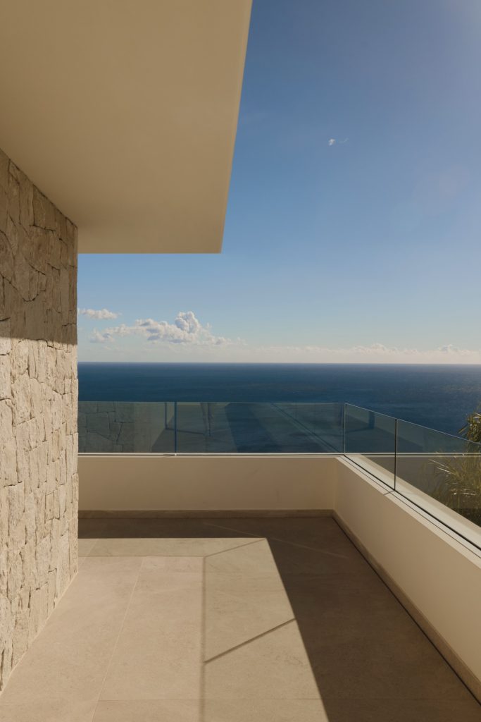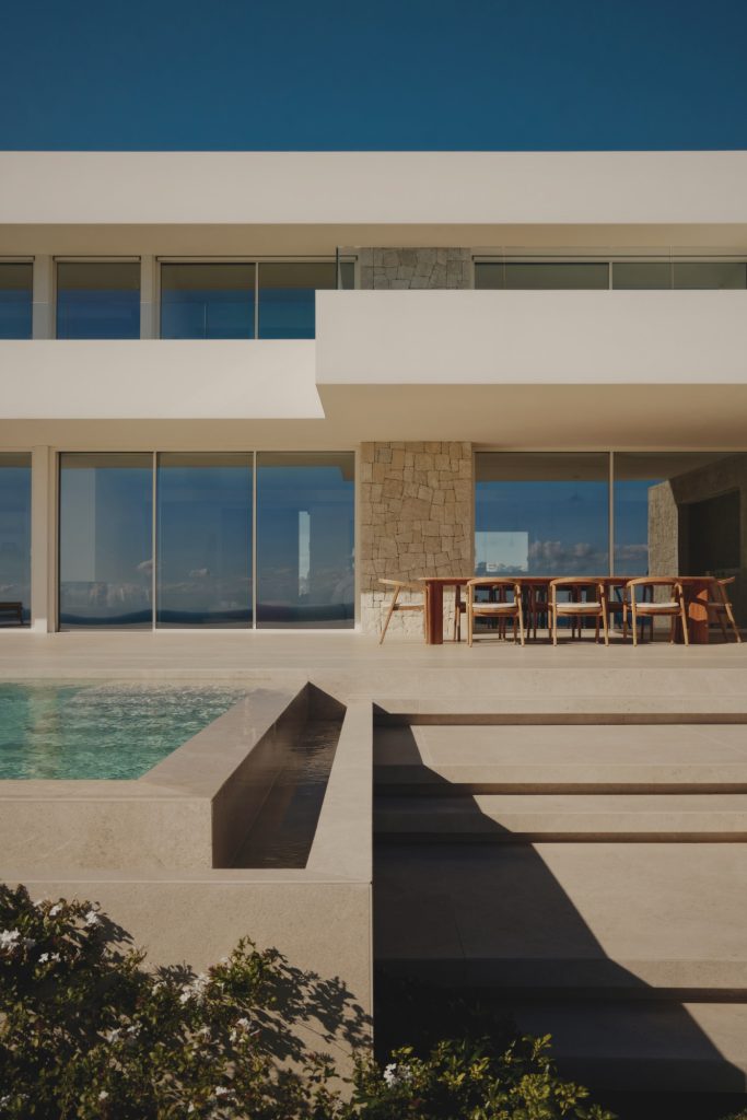 The infinity pool reinforces this spatial continuity. Its water surface visually merges with the Mediterranean beyond, extending the landscape and strengthening the perception of an unbroken horizon between architecture and nature.