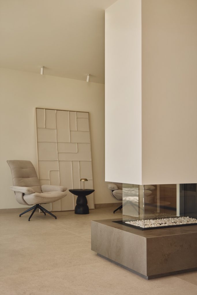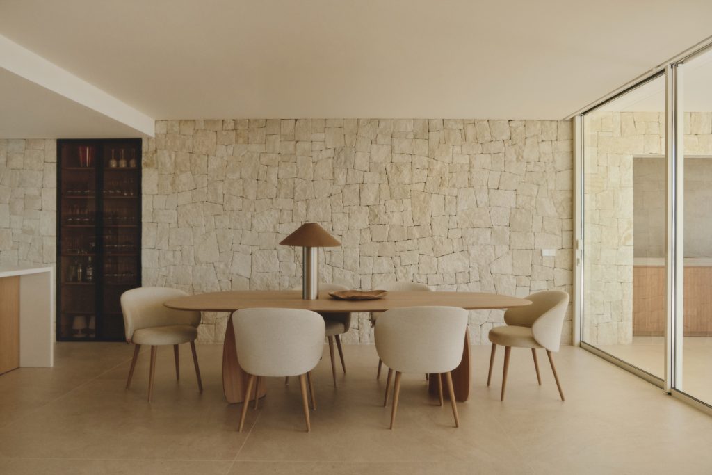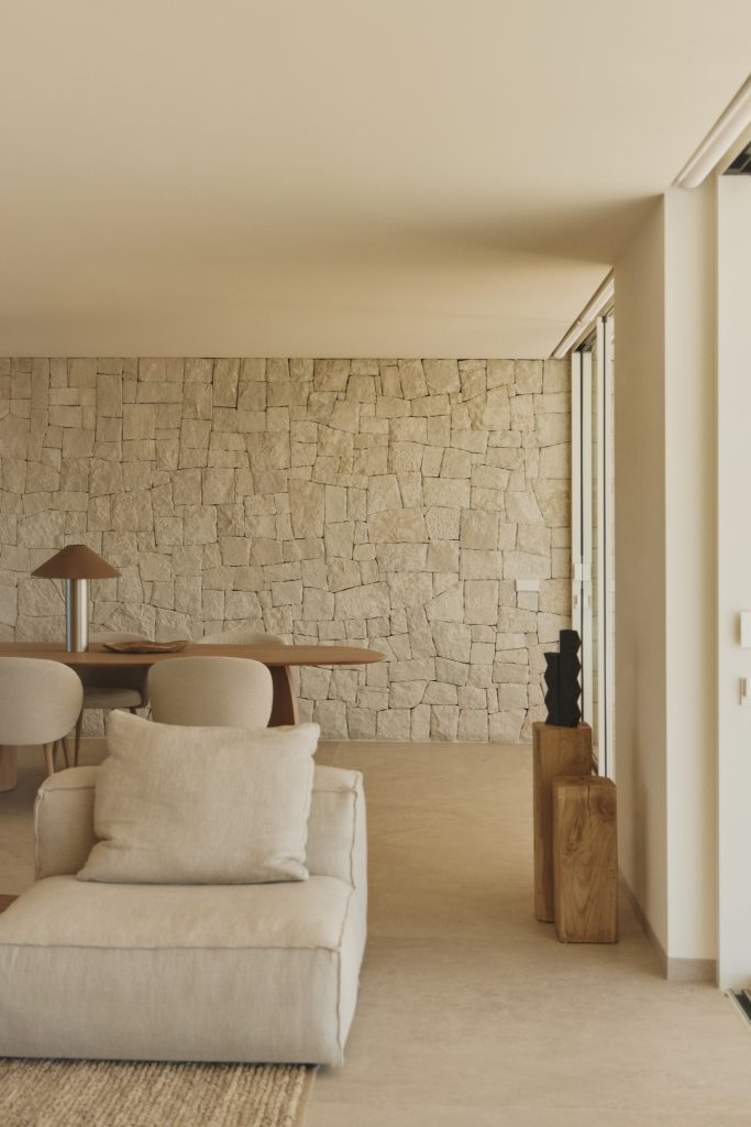 Natural stone walls introduce density and tectonic gravity, while timber elements soften the interior and provide a sense of domestic warmth. Rather than functioning as decorative finishes, materials operate as structural components of the architectural language. Each surface, texture and piece of furniture contributes to a calm and coherent spatial environment.