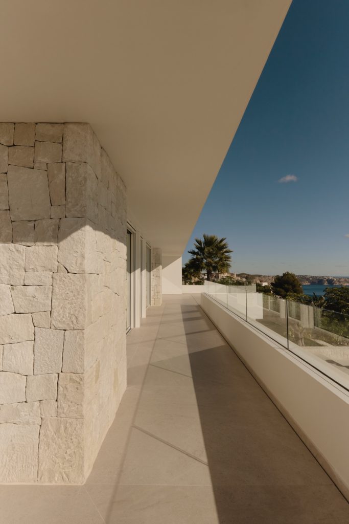 The architectural composition is defined by the superposition of horizontal white planes that rest on plinths of natural stone. This dialogue between lightness and mass establishes a careful balance between abstraction and tectonic presence. The white volumes appear to float above the terrain, while the stone base anchors the building to the ground, allowing it to settle naturally into the coastal landscape.