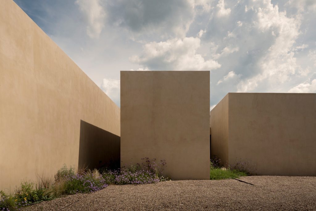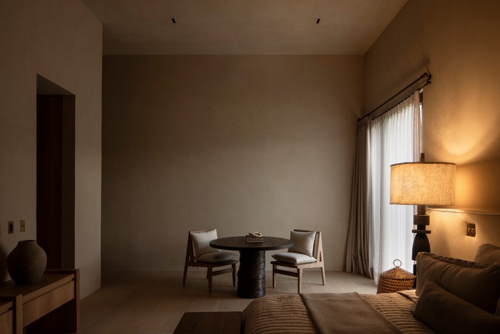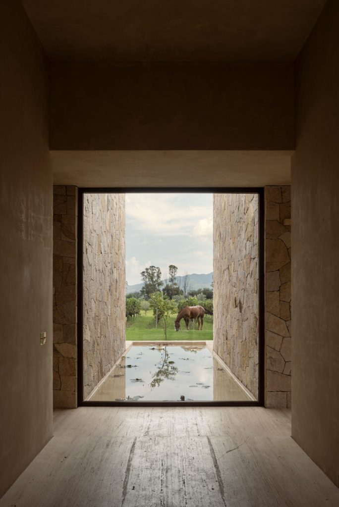 The project advances a material strategy grounded in simplicity and permanence. Architecture becomes a vessel through which time can be felt, recalling the patina and quiet austerity of historic convents. Locally sourced stone defines the exterior, establishing a sober and timeless presence. Floors are finished in unpolished Mexican marble that softens with wear, and a hand-applied lime-based paint creates a unified, monochromatic tonality across all surfaces. These materials, used sparingly yet purposefully, form a set of contemporary monoliths that resonate with the history of the land.