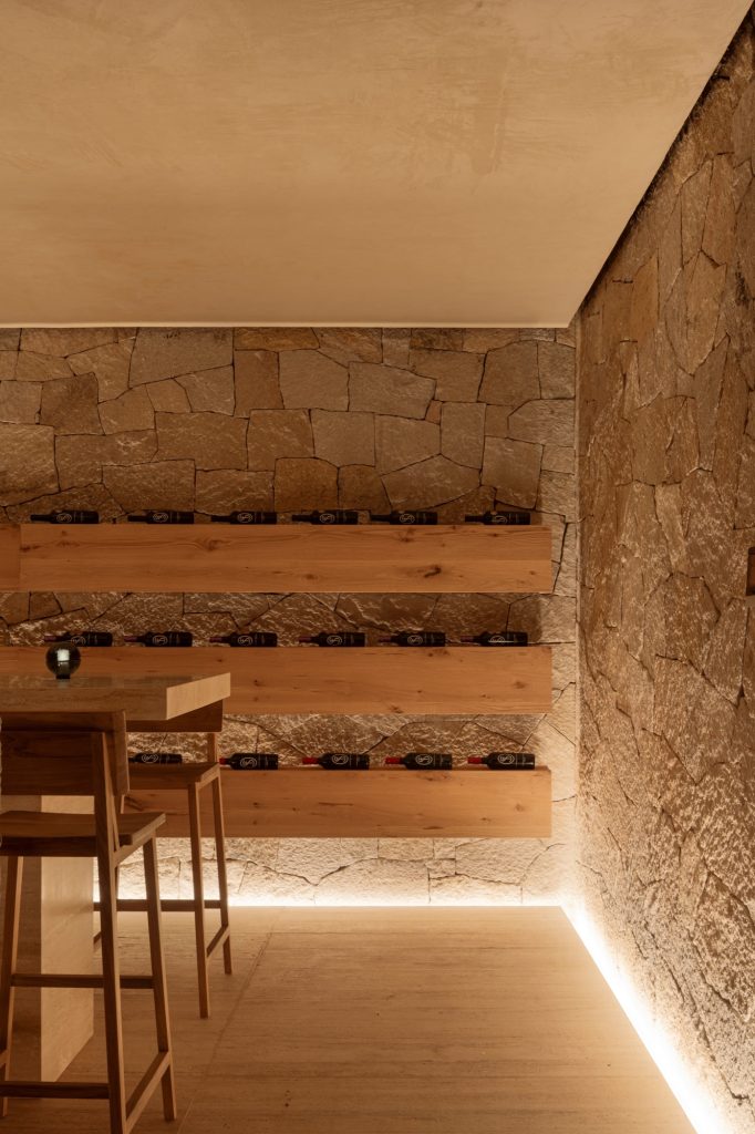 Interior furnishings in oak continue the theme of simplicity and restraint, while the lighting design emulates the warmth of sixteenth-century convent illumination without compromising visibility. Natural light enters generously through framed openings, reinforcing the connection with the surrounding terrain and enhancing the meditative character of the house.