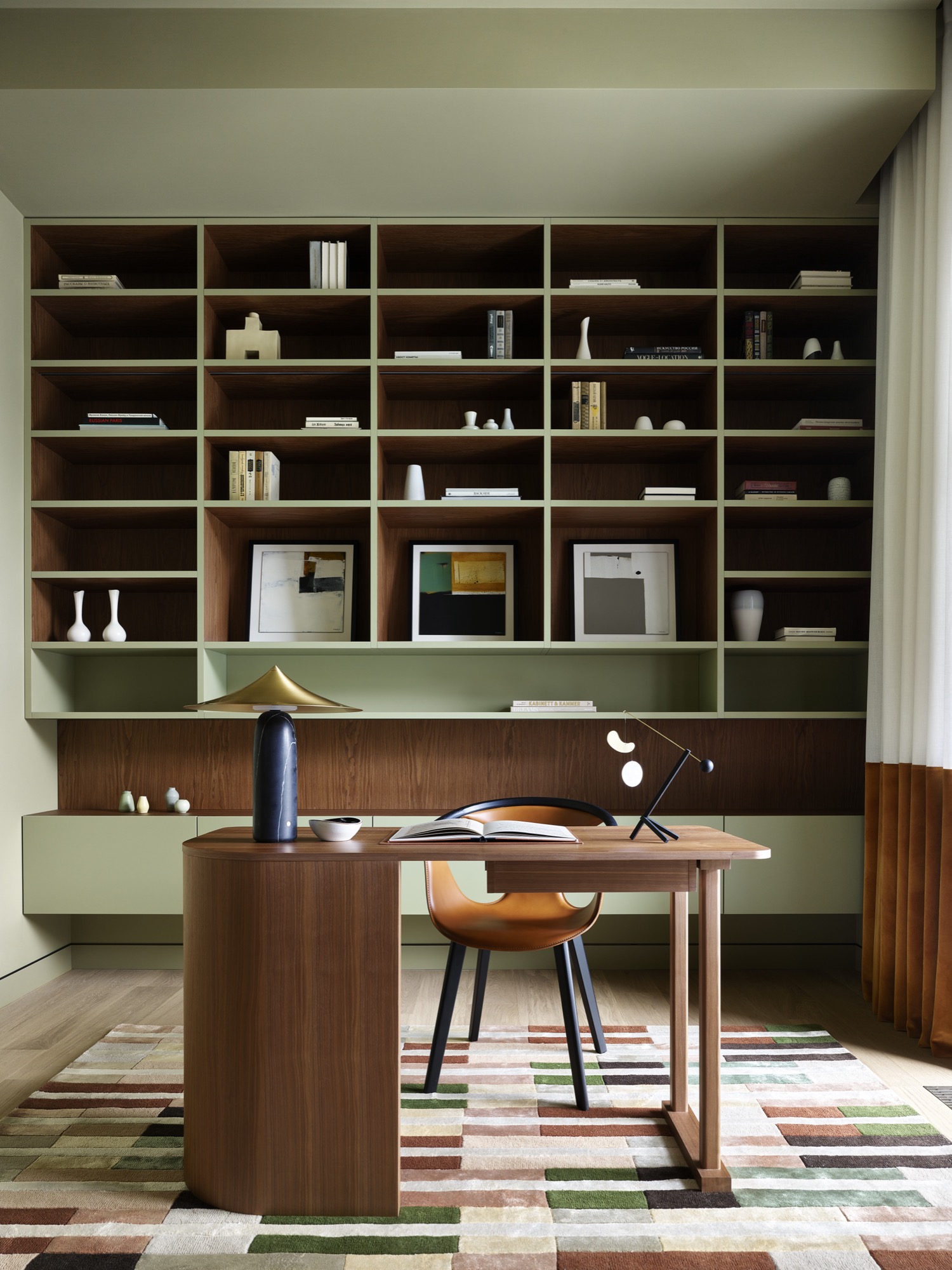 The Sarette apartment renovation transforms a 1970s home through a central green cube that structures circulation, light and material contrasts.