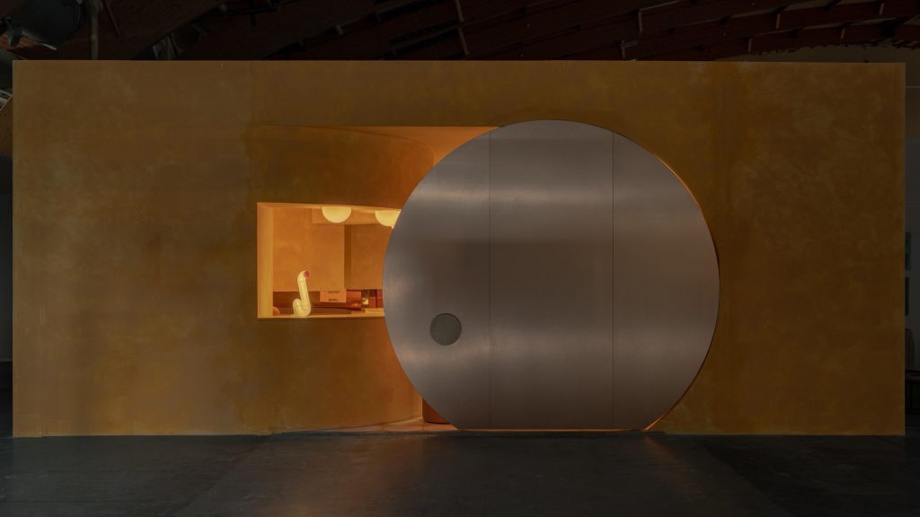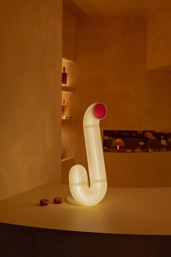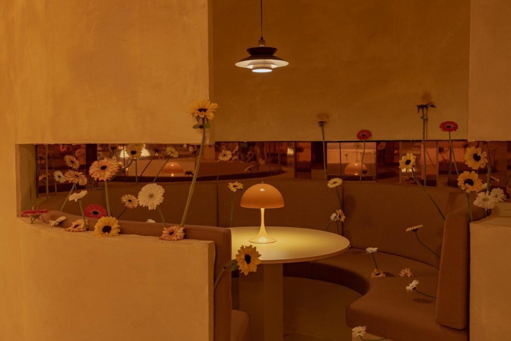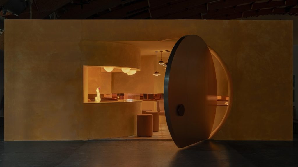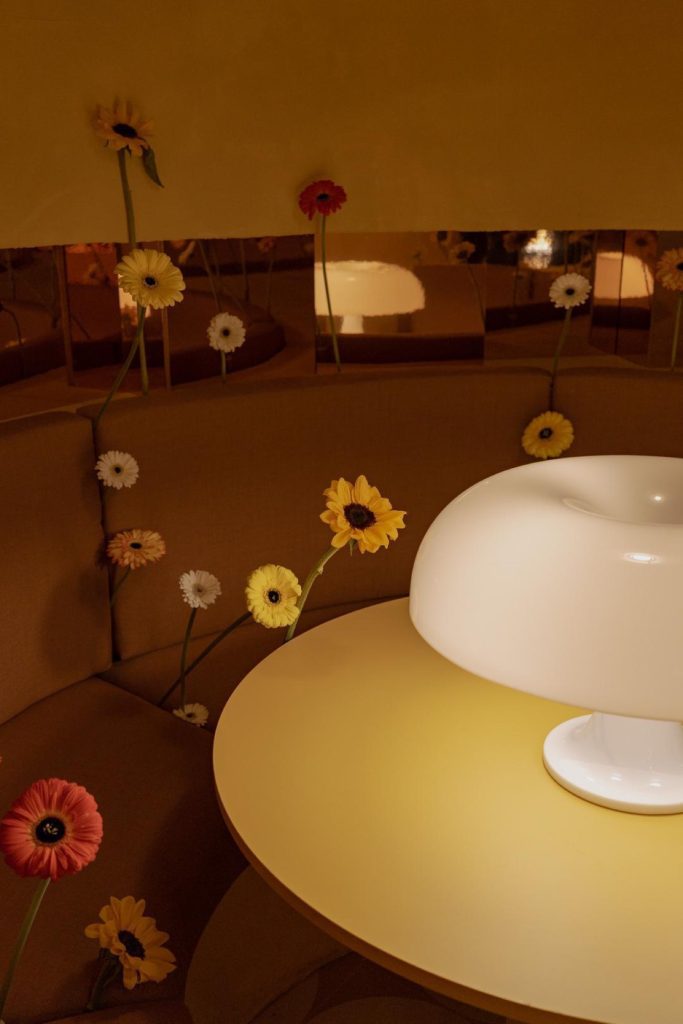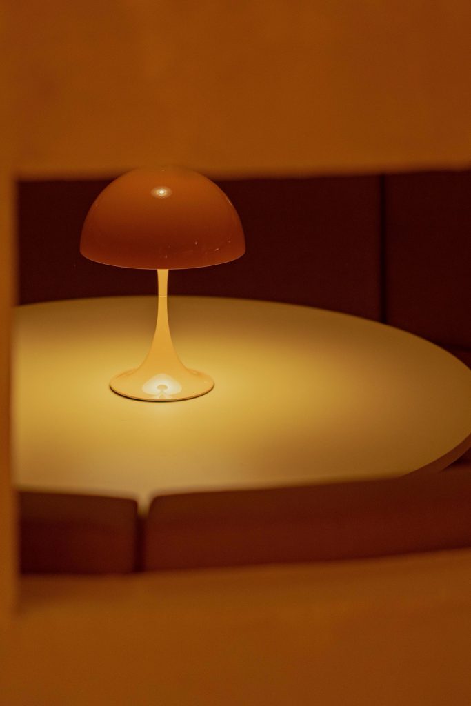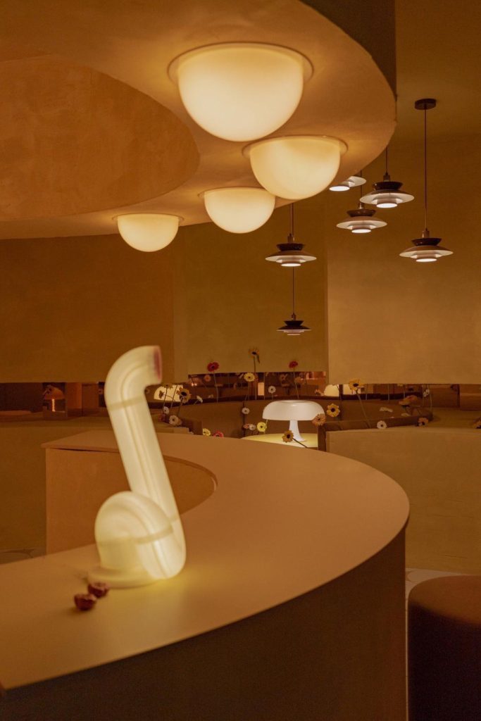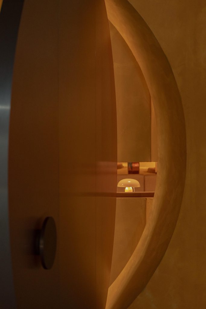Lighting becomes a central narrative device. Iconic pieces, including Panthella, Nesso, and Gambosa, are integrated alongside custom-designed elements such as the Sentry Sculpture Light. Together, they construct an environment where illumination is not merely functional but atmospheric, shaping perception and guiding movement. The entrance sequence reinforces this condition through a monumental circular door, three meters in diameter, evoking both Venturi’s notion of symbolic architecture and the expressive façades of historic nightclubs along the Costa del Sol.
