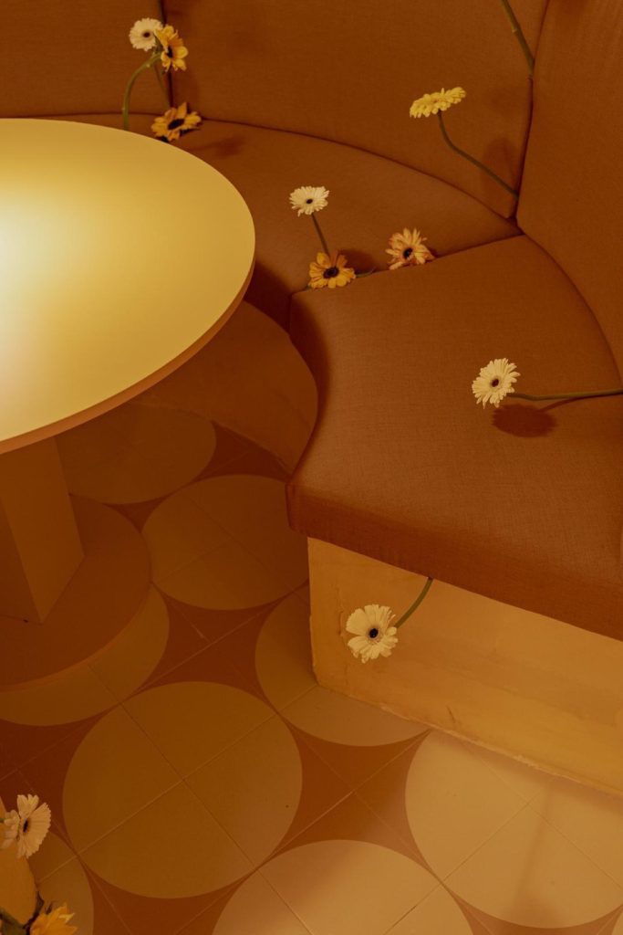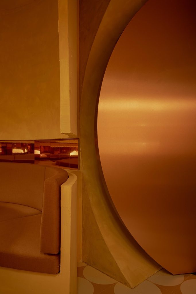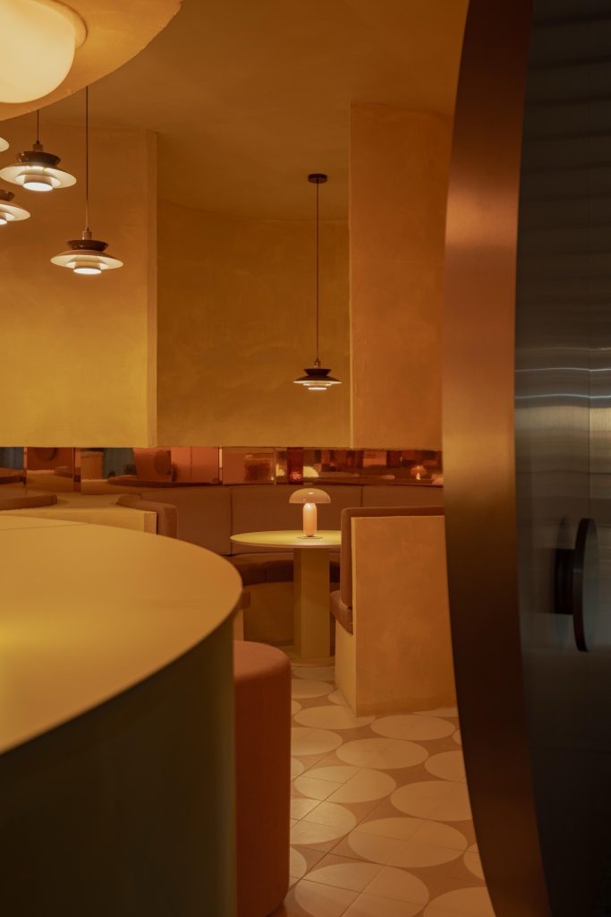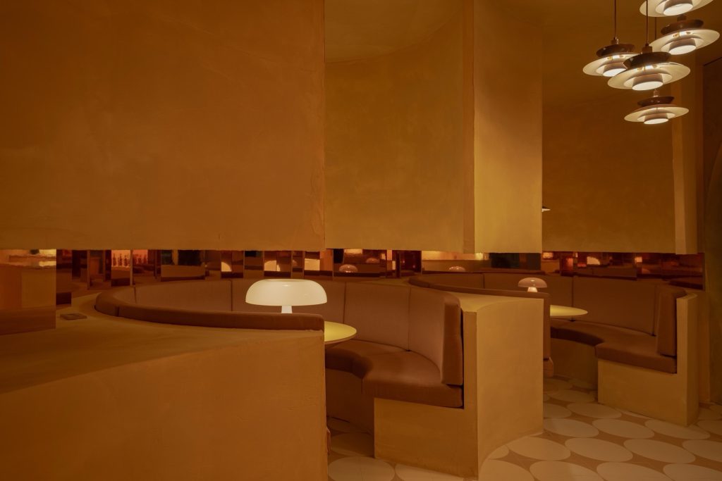 At the core of the design lies a single, consistent formal gesture: the cylinder. This geometry is deployed across scales and functions, structuring the project’s spatial language. It appears as voids carved into seating, as volumetric masses shaping the bar and stools, and as a repeating motif embedded within the ceramic flooring. Doors, thresholds, and custom lighting elements extend this logic, producing a continuous field where architecture dissolves into object and atmosphere. In this controlled system, decoration is deliberately reduced, allowing spatial expression to emerge through the interplay of geometry, color, and light.