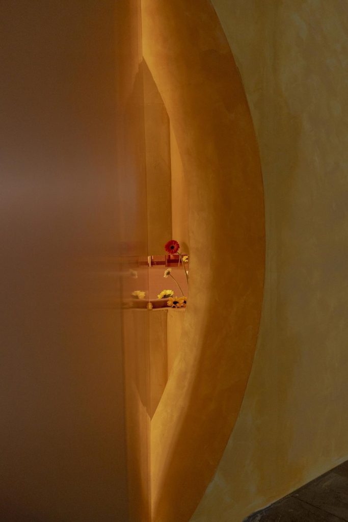 An additional layer is introduced through an installation developed in collaboration with interior landscaper Charo Benitez. Vegetation, including gerberas and sunflowers, occupies the space as a subtle commentary on the abandonment of many leisure structures from the 1960s. This intervention reflects processes of natural reclamation while raising questions about preservation and adaptive reuse.