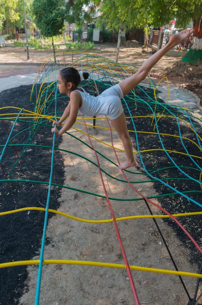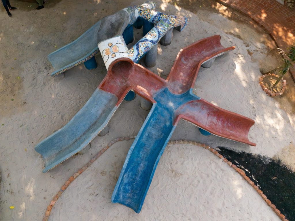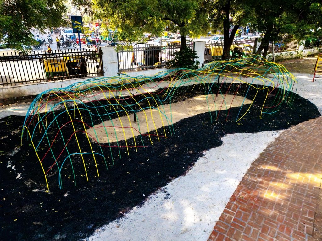 Sustainability is not treated as an accessory here. It becomes a second foundation, shaping materials and assembly from the outset. The project reuses, regenerates, and recycles over 30,000 square feet of material, including concrete, tiles, mild steel rods, bricks, tyres, and wood. These reclaimed elements are recast as pathways, gazebos, trellises, edging, benches, and play structures, turning what would have been waste into the park’s primary infrastructure.