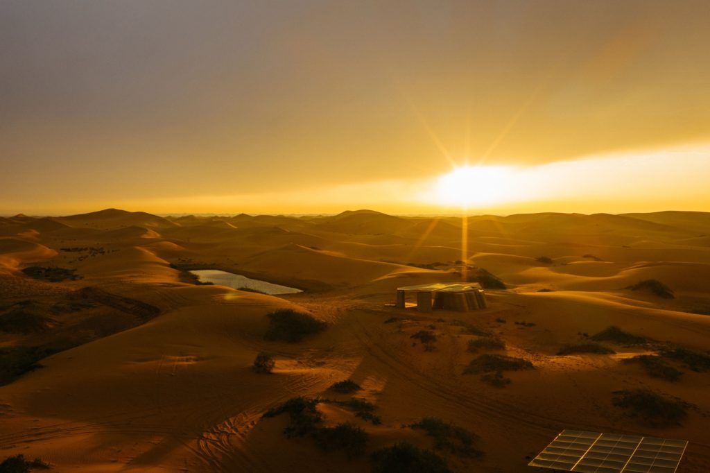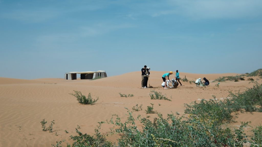 The project operates entirely off-grid using high-efficiency solar panels, Low-E glass openings, and a retractable canopy that controls heat gain. A biodegradable septic system allows the camp to recycle 100% of its wastewater for irrigation, supporting the ongoing afforestation program. The raised deck sits on reusable cargo pallets, ensuring minimal disturbance to the desert floor and enabling future relocation.