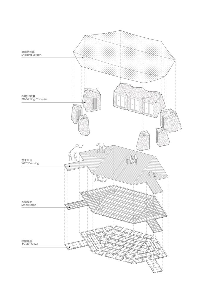 Materials: 3D-printed concrete, Wood-plastic composite floor, Cargo pallets, High-strength fiber shading net, Solar panels, Battery system