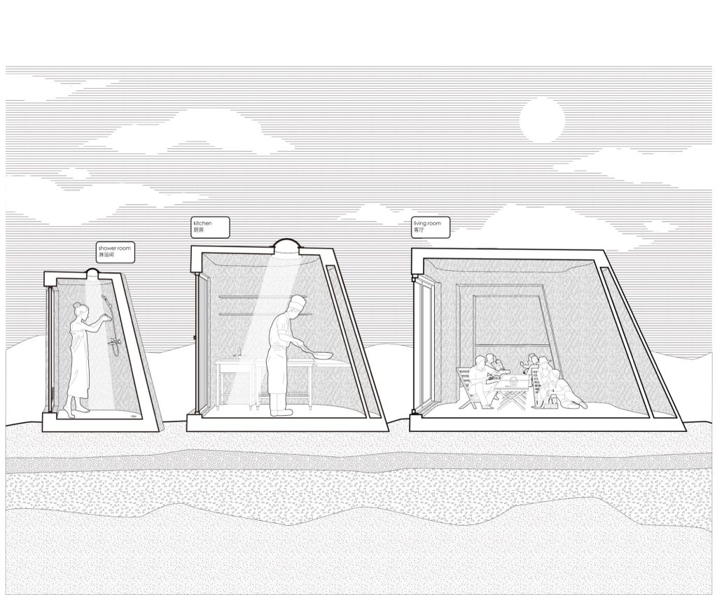 The Tengger Desert is known for strong winds, extreme temperature fluctuations, and limited infrastructure. Desert Ark responds to these challenges with aerodynamic forms that reduce wind load and a layered concrete texture that echoes the surrounding dunes. The thick, cavity-rich printed walls provide excellent insulation, maintaining indoor comfort from 45°C summers to -30°C winters.
