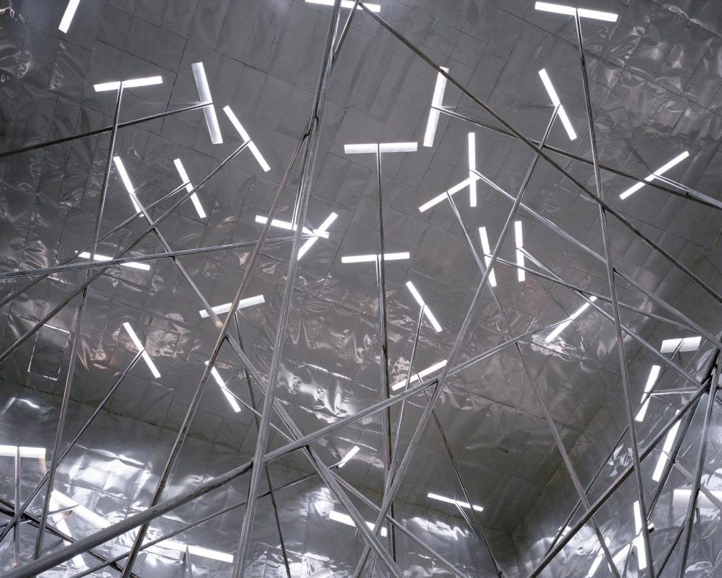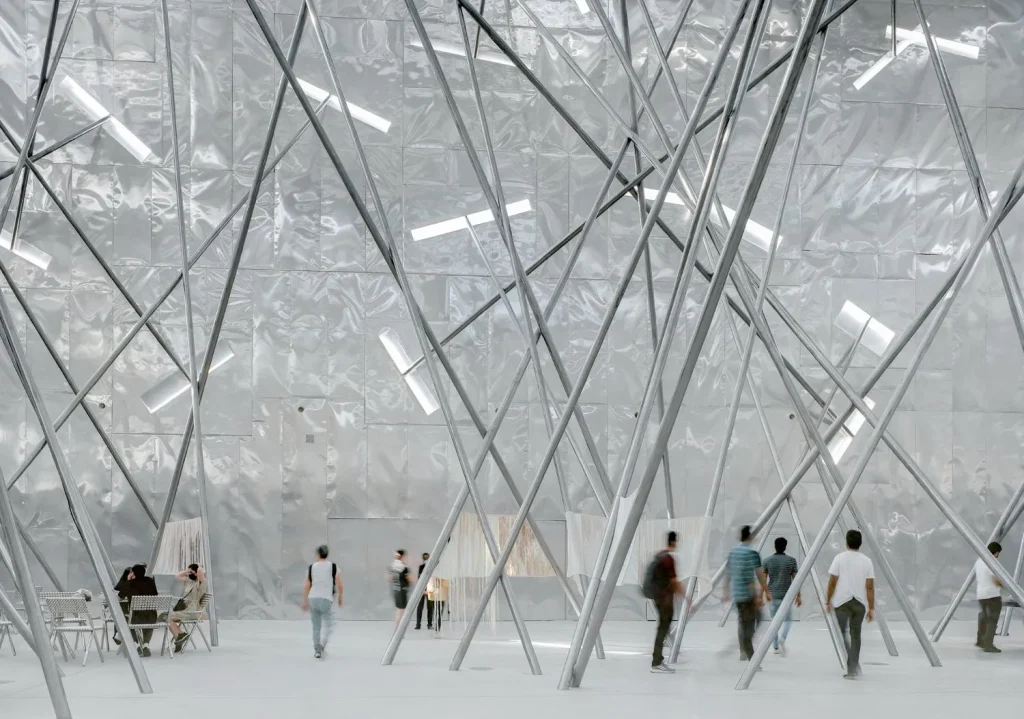 The experience begins immediately with light. The exterior is clad in reflective aluminium, and inside the shifting brightness is not an afterthought but a spatial material. Sunlight threads between inclined members and rebounds off the cladding, throwing patterns that slide across floors and bodies. At certain angles, the hall feels open and buoyant; a step later, the same room tightens as lines of steel gather in front of you. The eye keeps recalibrating. You look for a clear frame, and the building refuses to give you one for long.