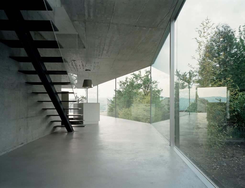 That line can be traced through earlier buildings. In the House with One Wall in Zurich-Witikon, completed in 2007, a single serpentine concrete element becomes the organising principle for a duplex. The gesture is economical, almost blunt, but it produces an intricate domestic landscape, with rooms connected and separated by the same continuous line. The “one wall” is not a metaphor. It is a structural decision that generates plan, section, and lived experience.