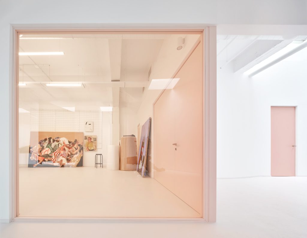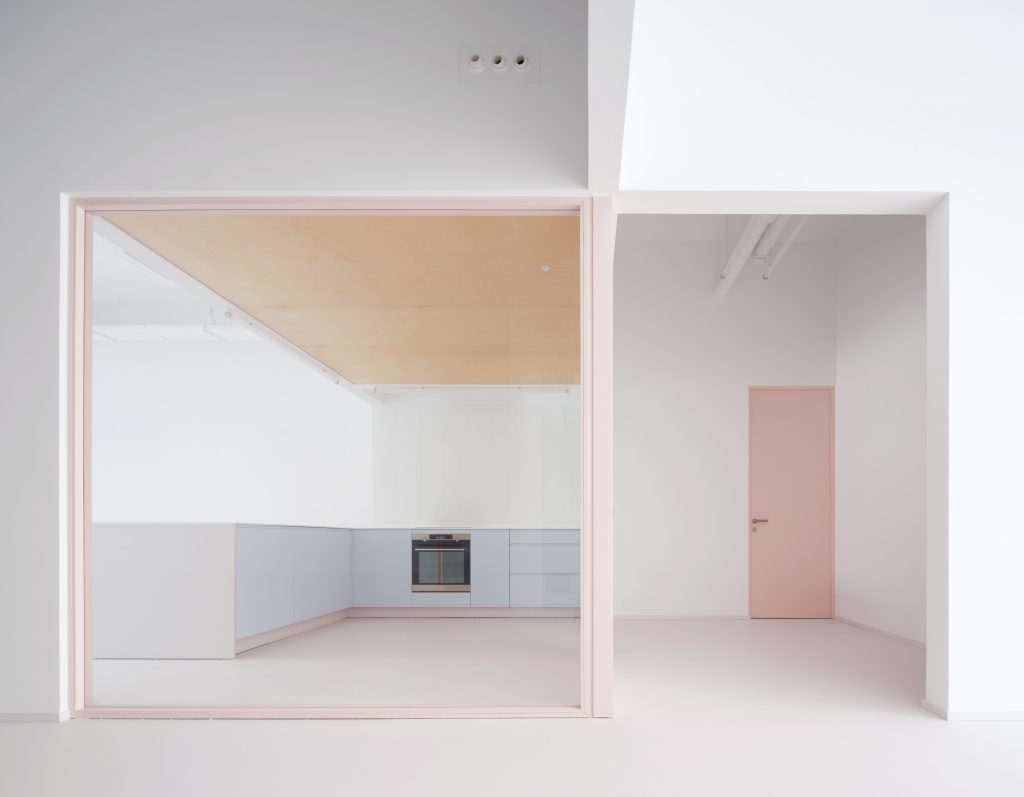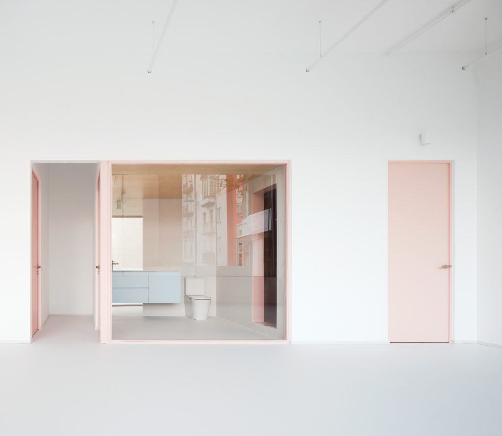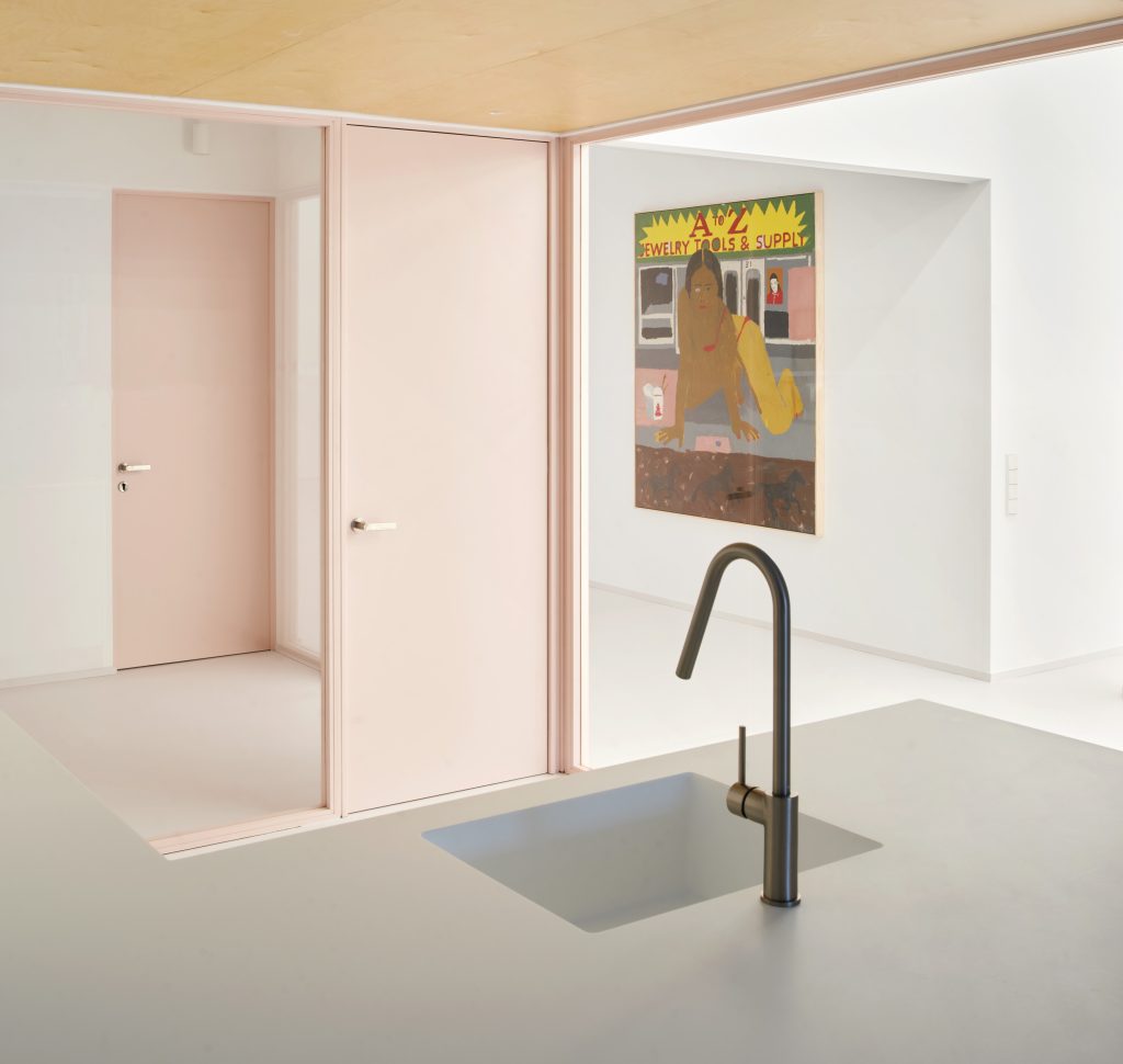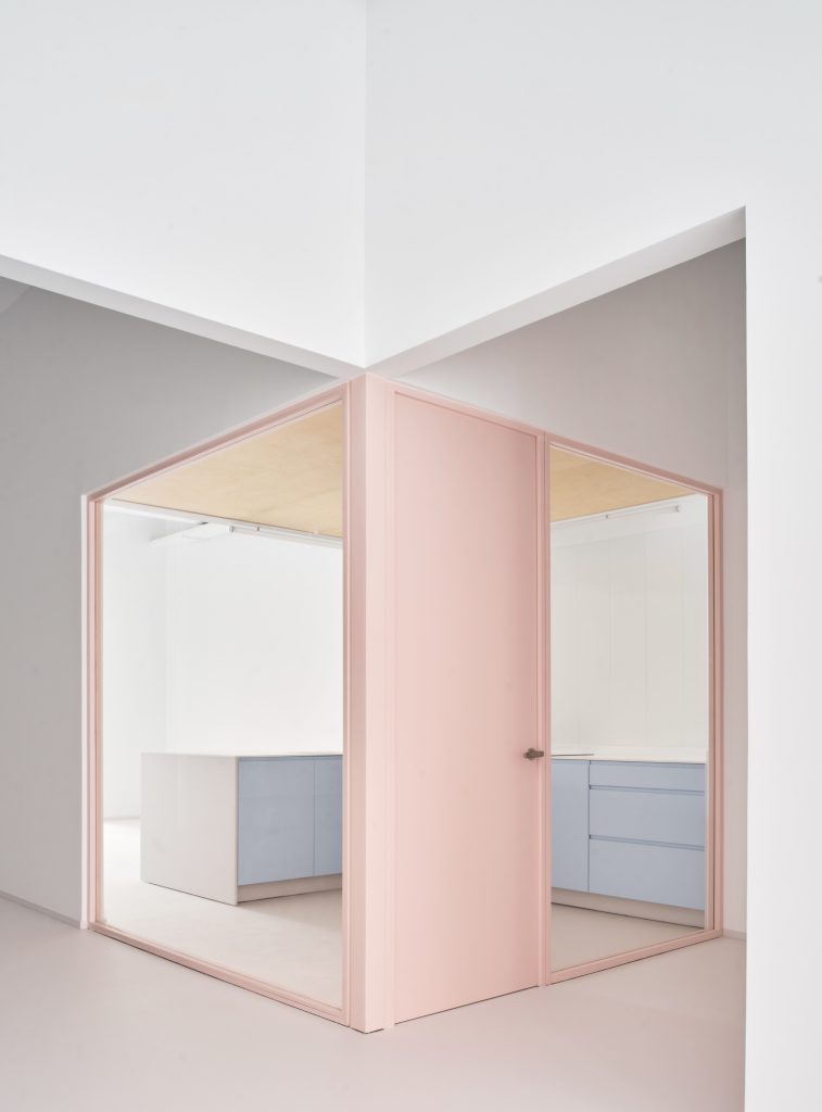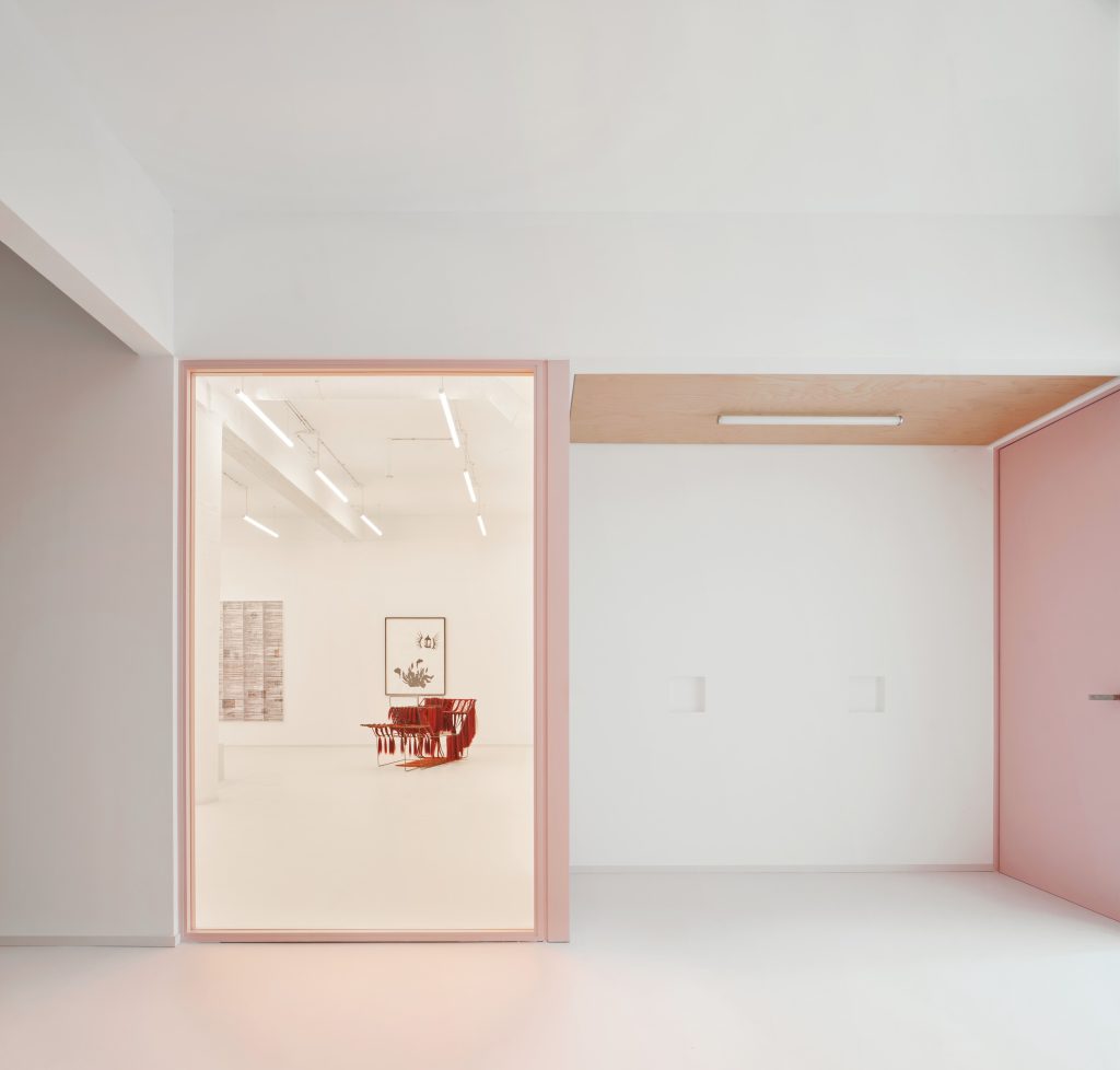 Square glass partitions framed in pink act as the primary connective device throughout the project. Repeated consistently across the space, they maintain uninterrupted visual continuity between exhibition and service areas. Through these frames, artworks remain constantly visible, while daily activities such as cooking, working, or moving through the space appear as carefully composed scenes.