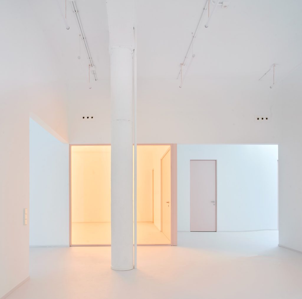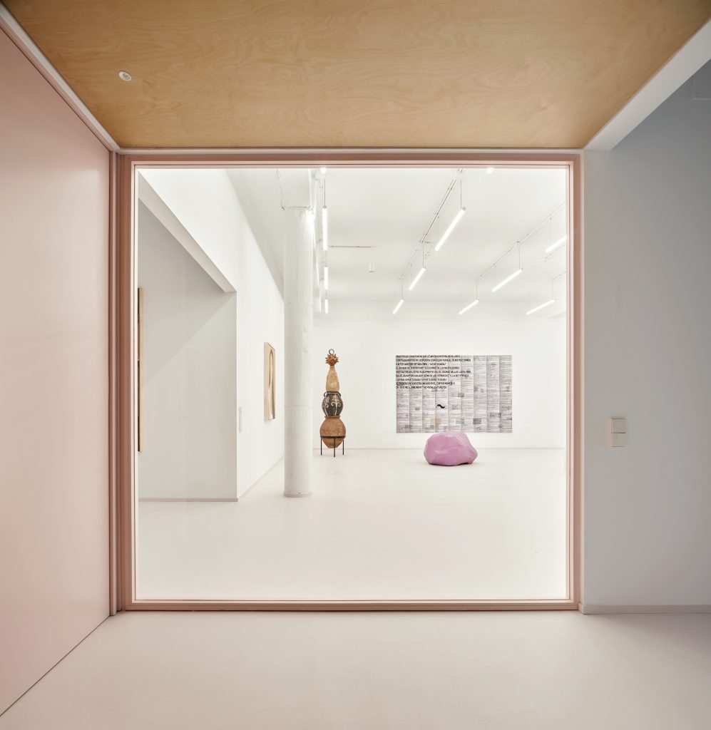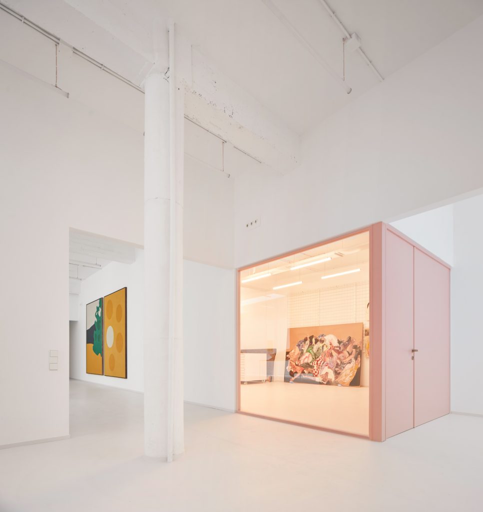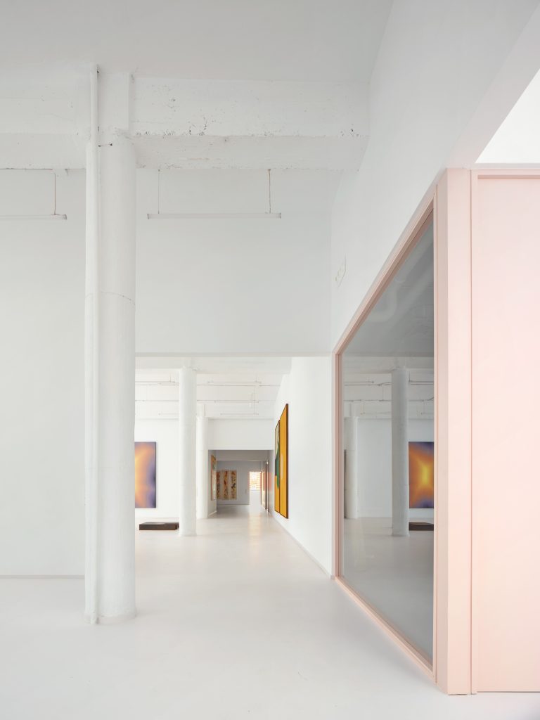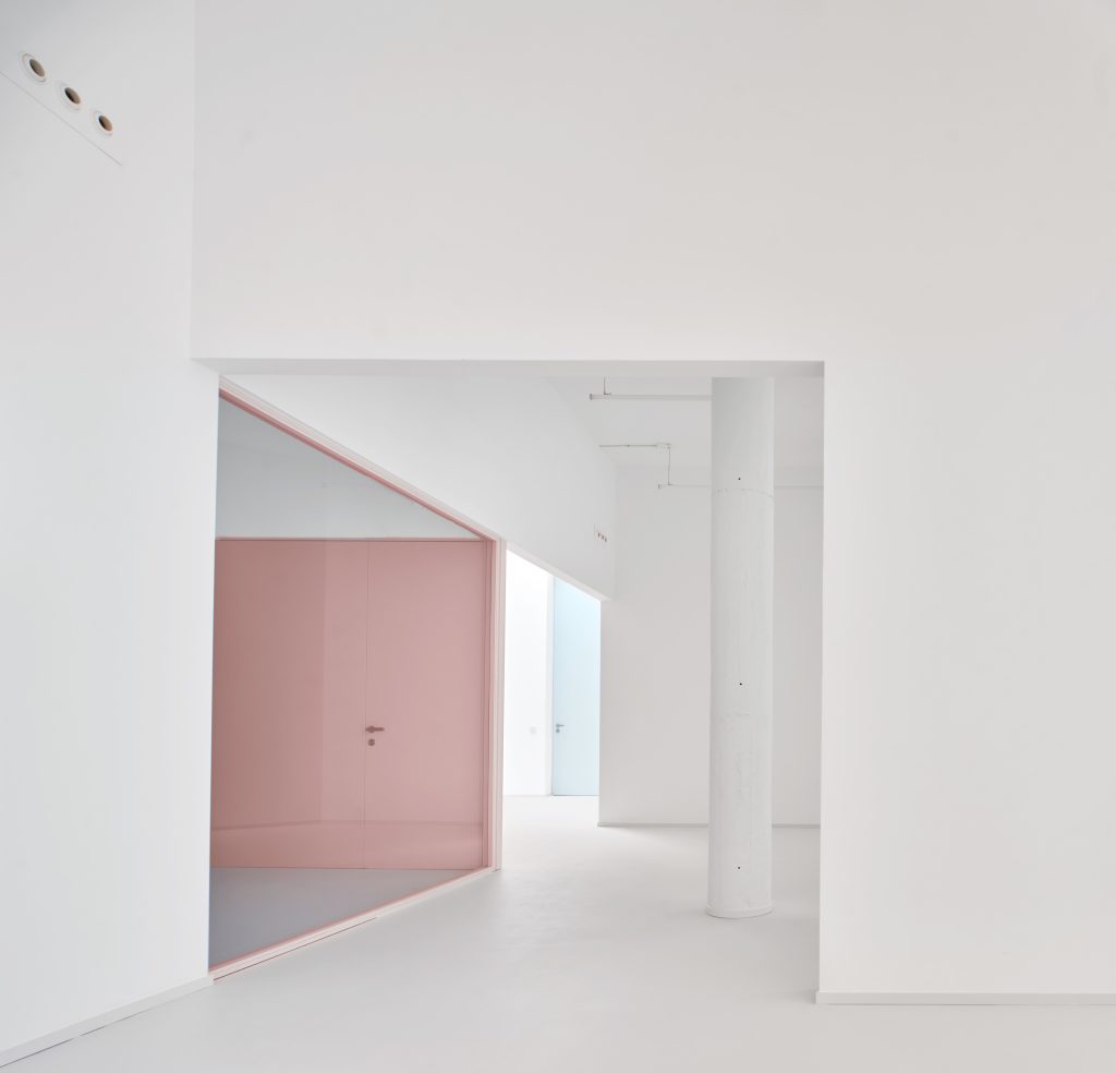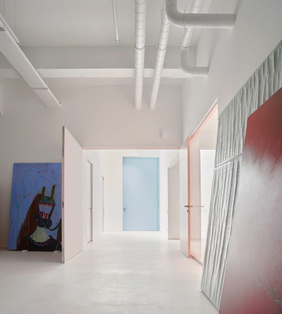 White surfaces dominate the interior, creating a neutral backdrop for the artworks while amplifying light and spatial clarity. This base is subtly softened through carefully chosen accents. Grey flooring grounds the space, pink frames introduce a graphic rhythm, light blue furnishings add a gentle chromatic counterpoint, and birch wood ceilings appear in smaller rooms to bring warmth and intimacy.