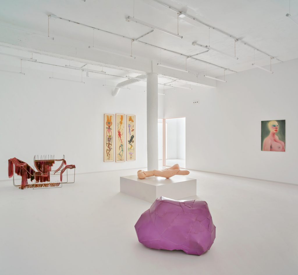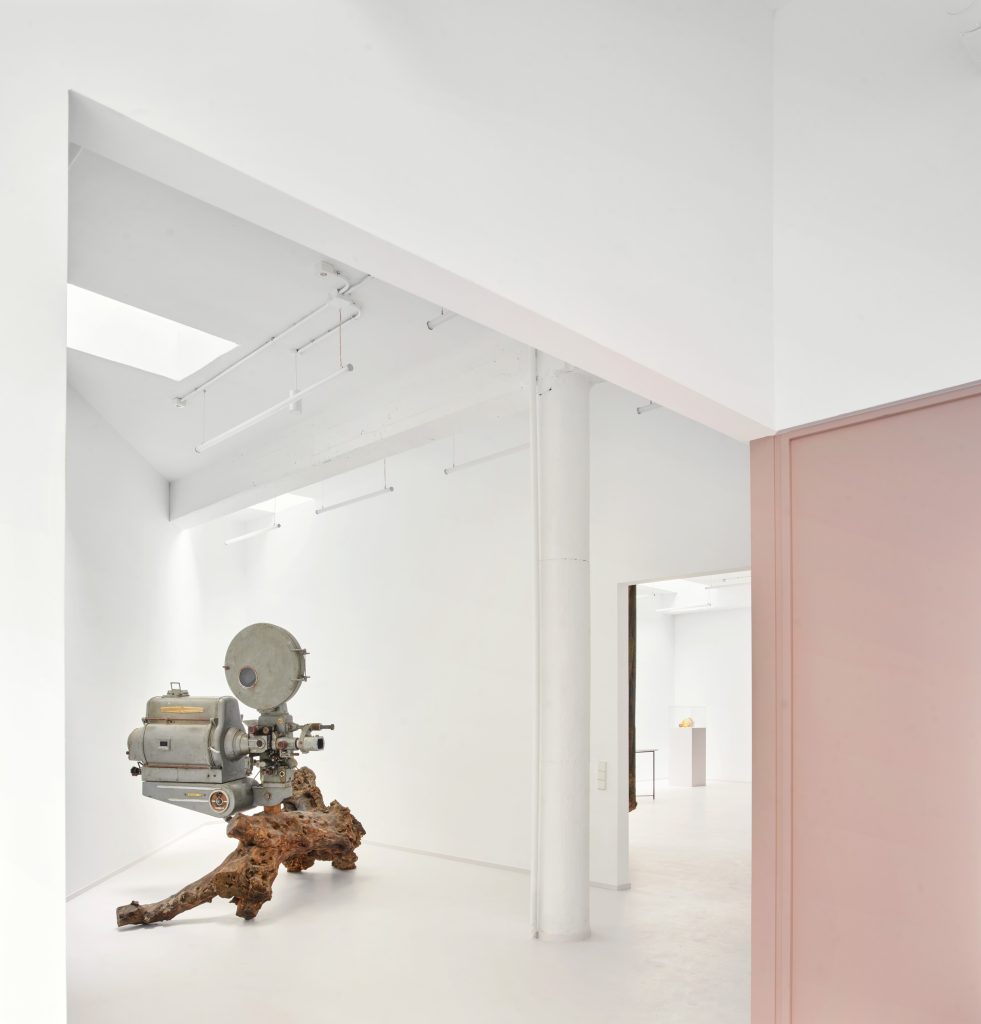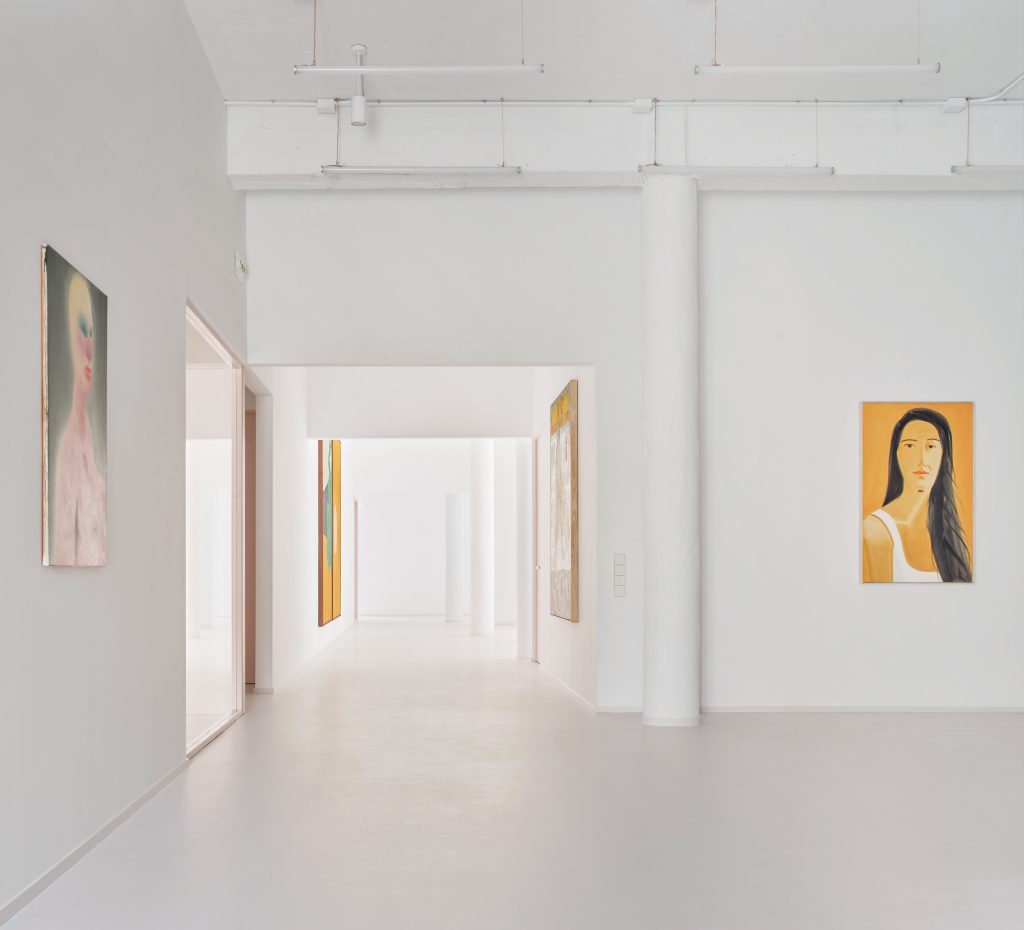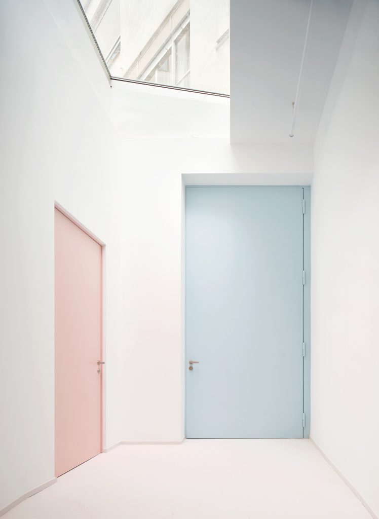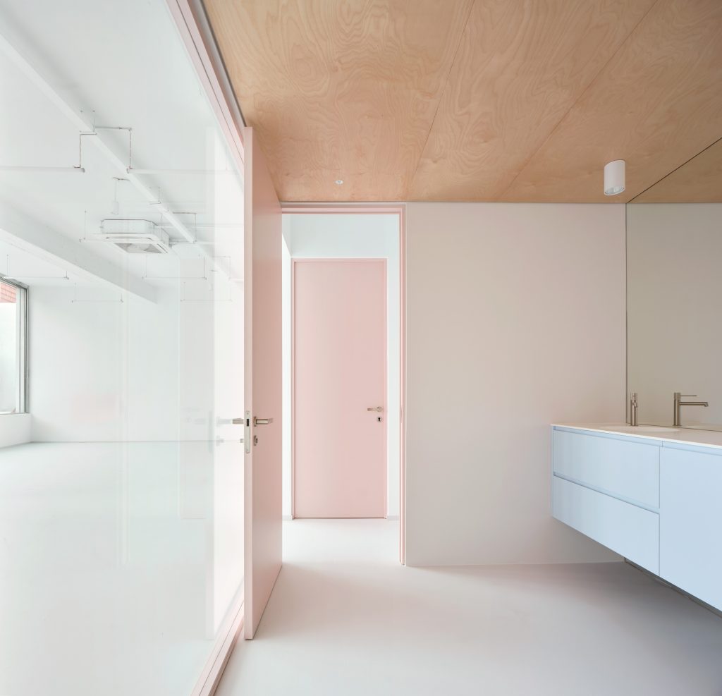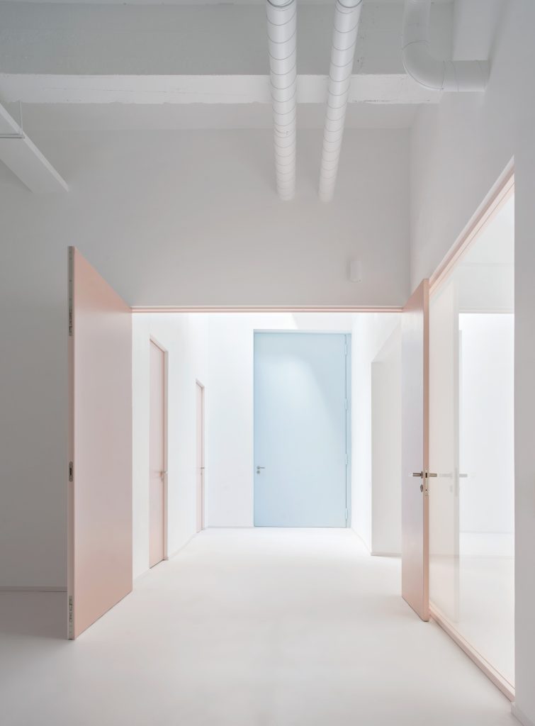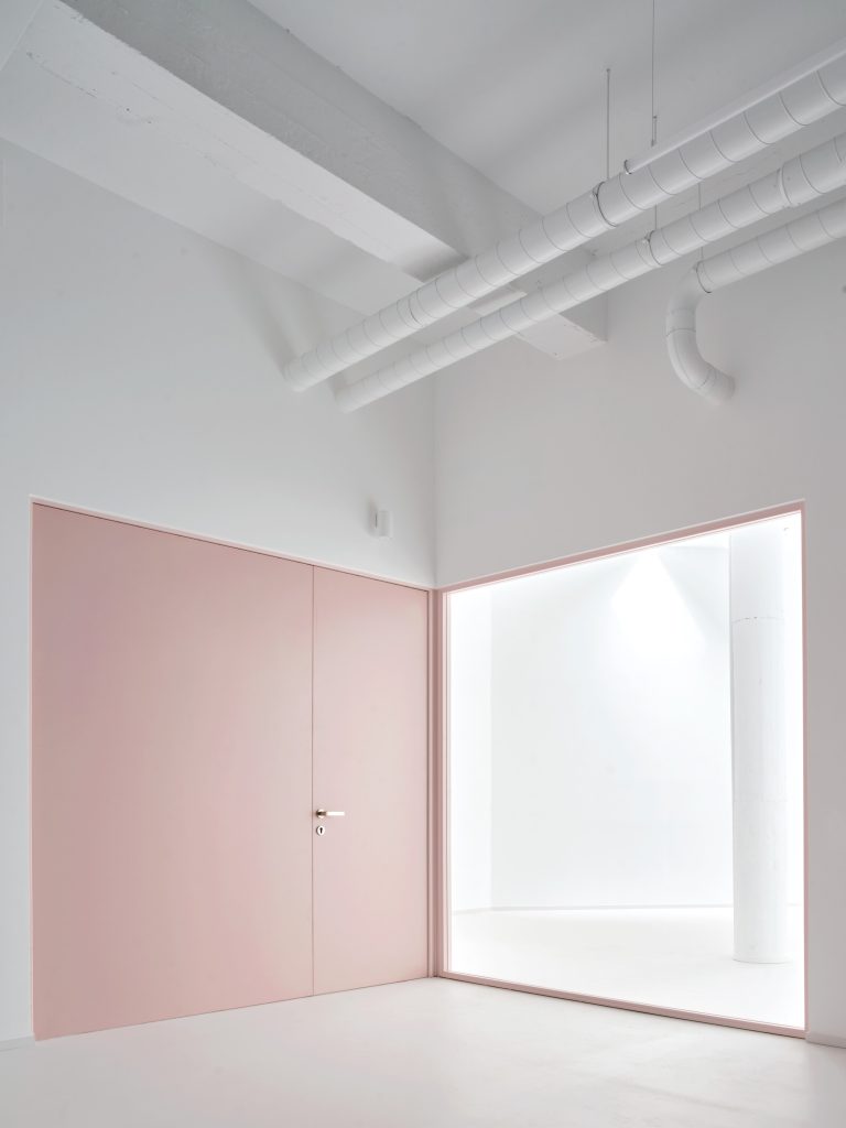 White surfaces dominate the interior, creating a neutral backdrop for the artworks while amplifying light and spatial clarity. This base is subtly softened through carefully chosen accents. Grey flooring grounds the space, pink frames introduce a graphic rhythm, light blue furnishings add a gentle chromatic counterpoint, and birch wood ceilings appear in smaller rooms to bring warmth and intimacy.