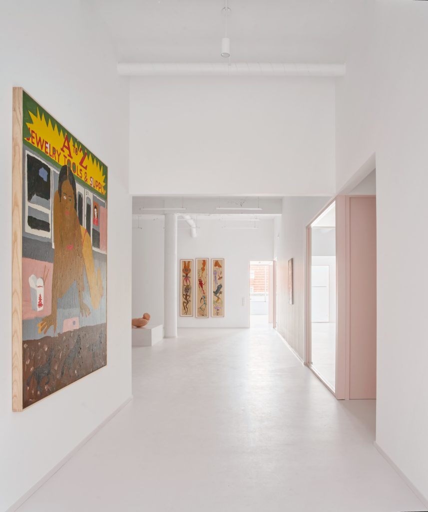 These utilitarian zones are not hidden away. Instead, they remain visually connected to the exhibition areas, reinforcing the idea that art and everyday life occupy the same spatial continuum.