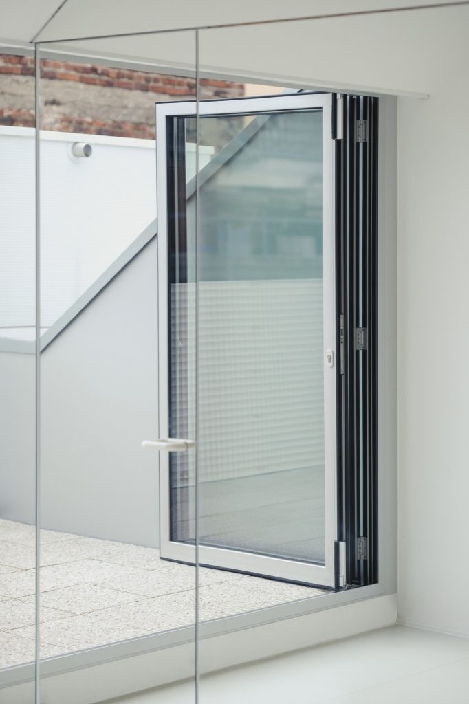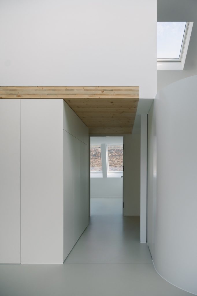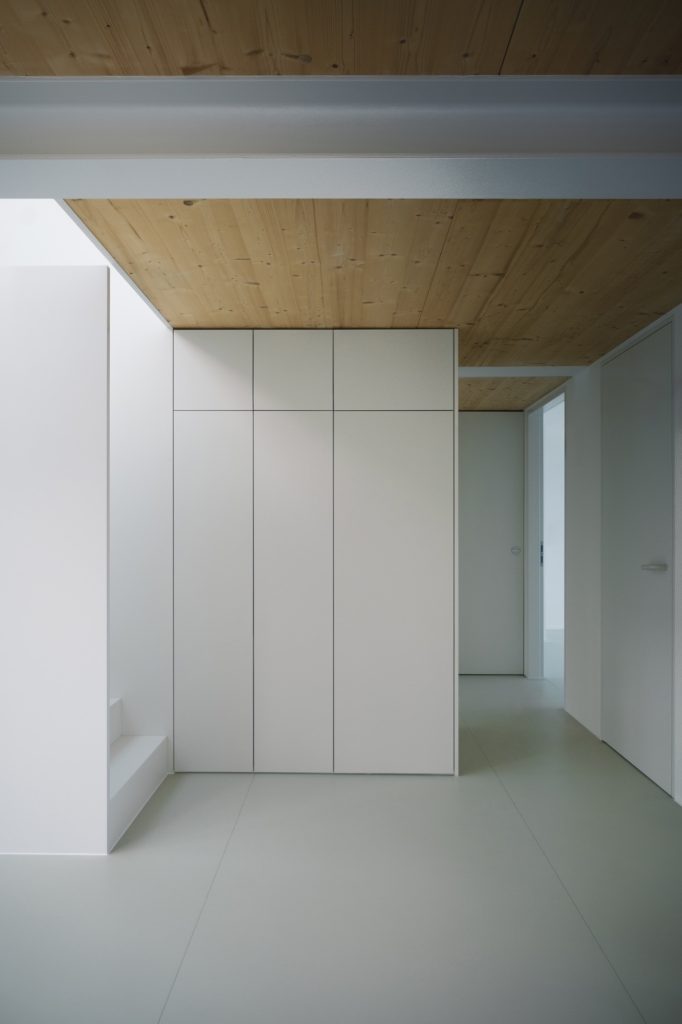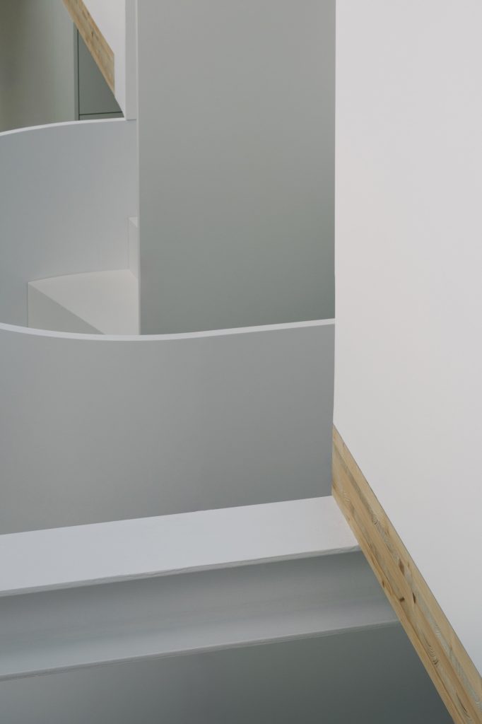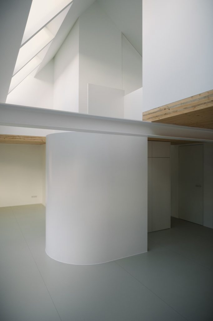 Inside, the plan is generated from a three-dimensional grid extrapolated from the existing structure, giving each room a distinct, almost sculpted profile. A generous living space runs along the north façade and climbs uninterrupted to the roof, while a central double-height core concentrates the programme, with service areas below and two bedrooms above. To the south, a third bedroom and a roof terrace open toward the courtyard, balancing privacy with daylight. A monochromatic palette sharpens the geometry, reinforcing the apartment’s abstract, volumetric character.