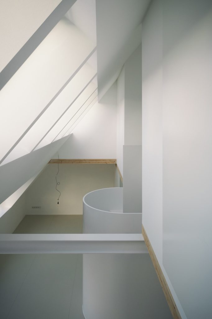 By lifting the ridge line to meet the surrounding roofscape, this Cologne retrofit expands an unused attic into a two-storey home shaped by a three-dimensional grid and defined by a monochrome, sculptural interior.