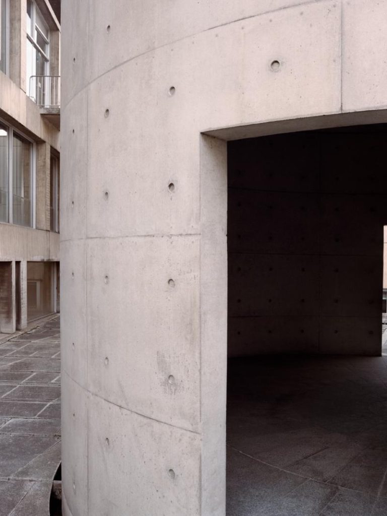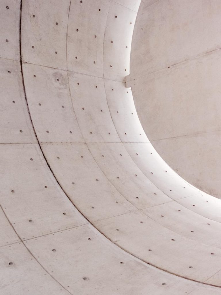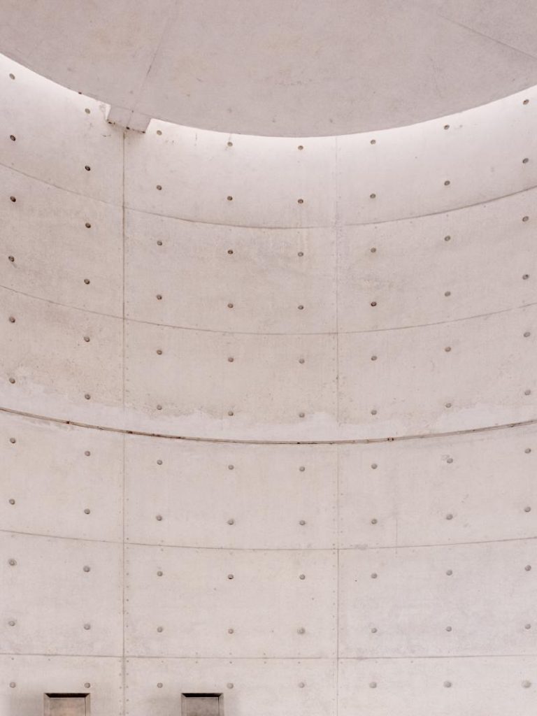 The architecture operates through reduction. Curved concrete walls enclose a quiet interior where narrow apertures admit controlled shafts of daylight. Water elements soften acoustics and heighten sensory awareness. The space exemplifies Ando’s exploration of silence, proportion and interval.