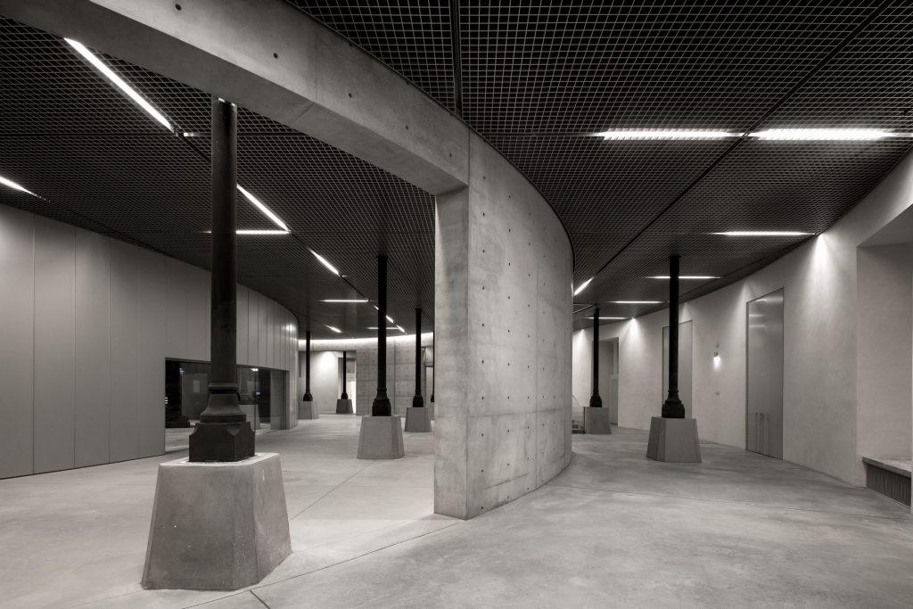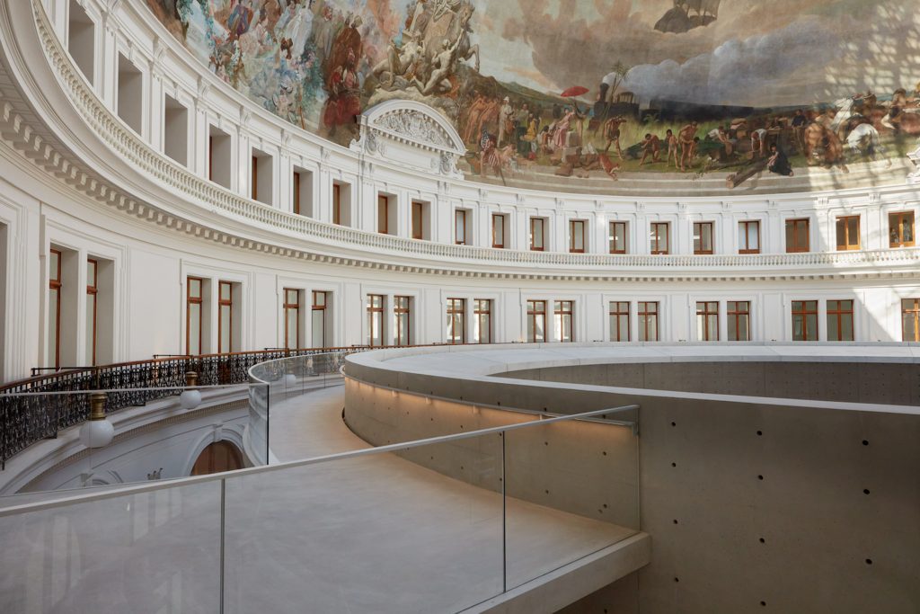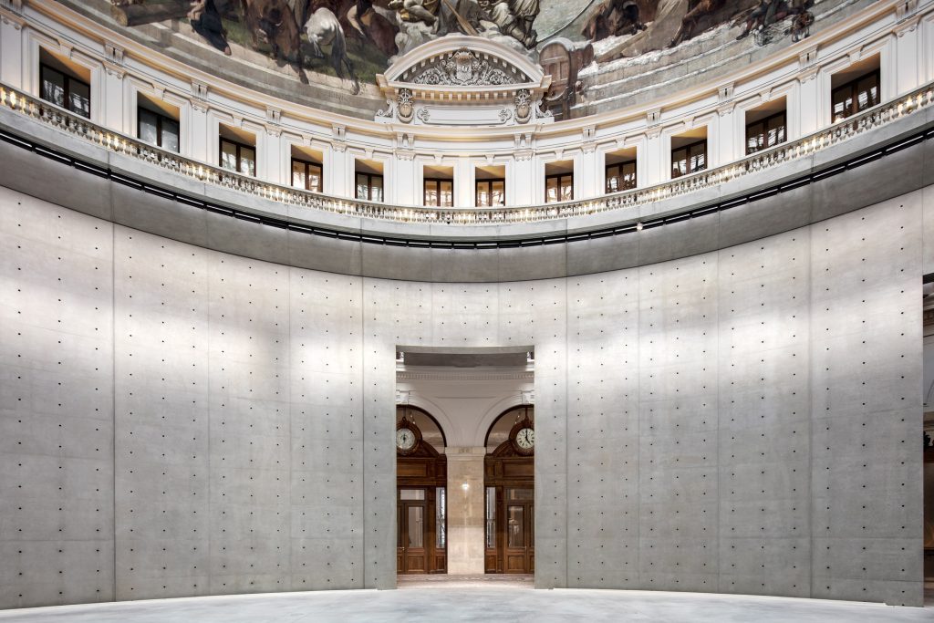 A nine metre high concrete cylinder was inserted within the historic rotunda, creating a concentric spatial sequence between neoclassical frescoes and contemporary minimalism. Visitors move along a circular promenade that reveals both painted heritage surfaces above and smooth concrete walls below.