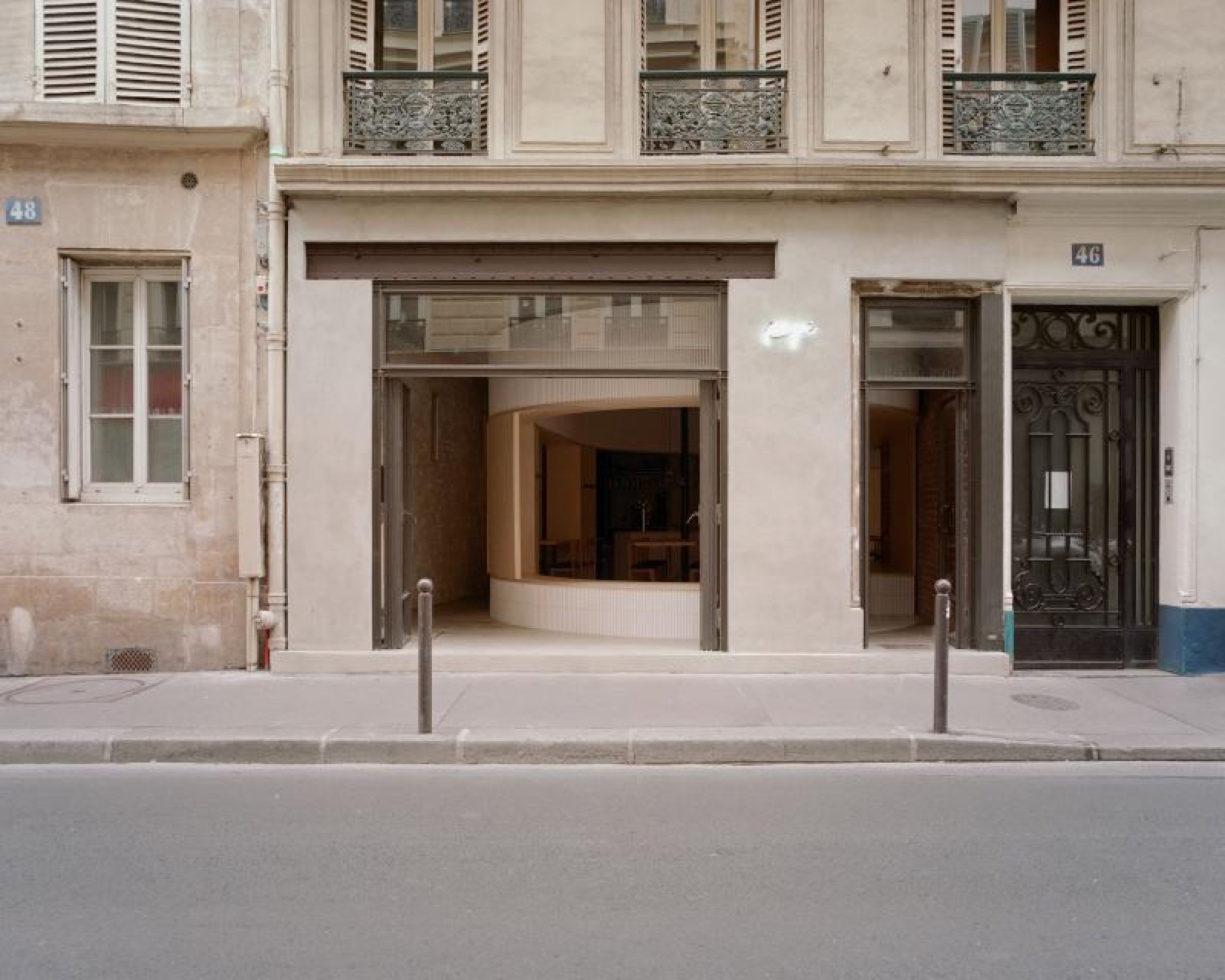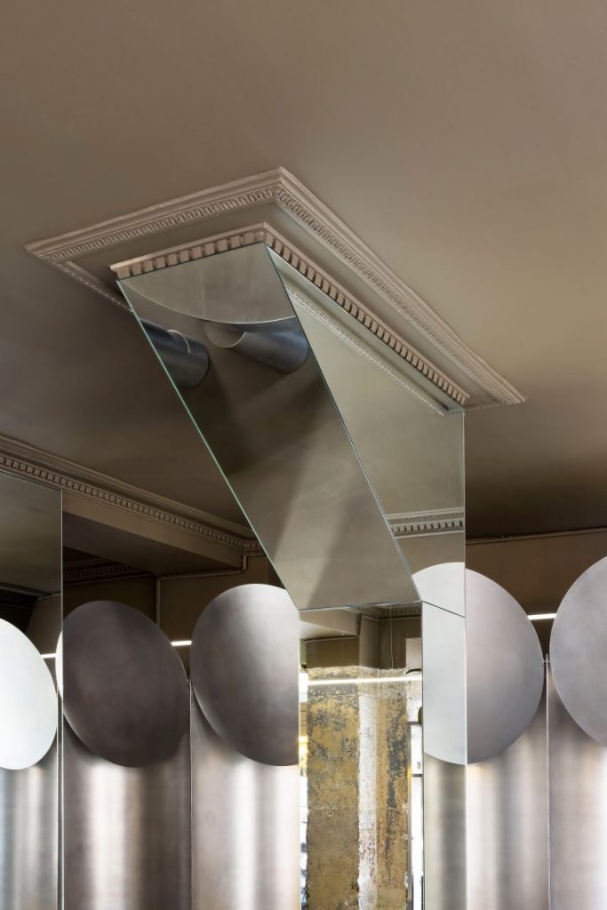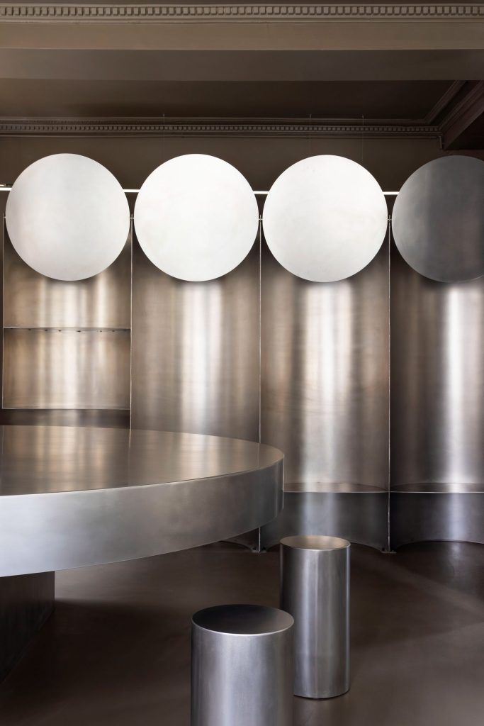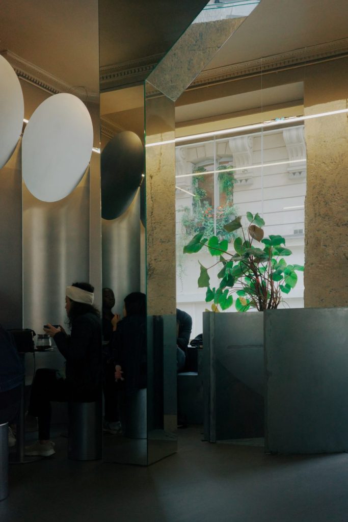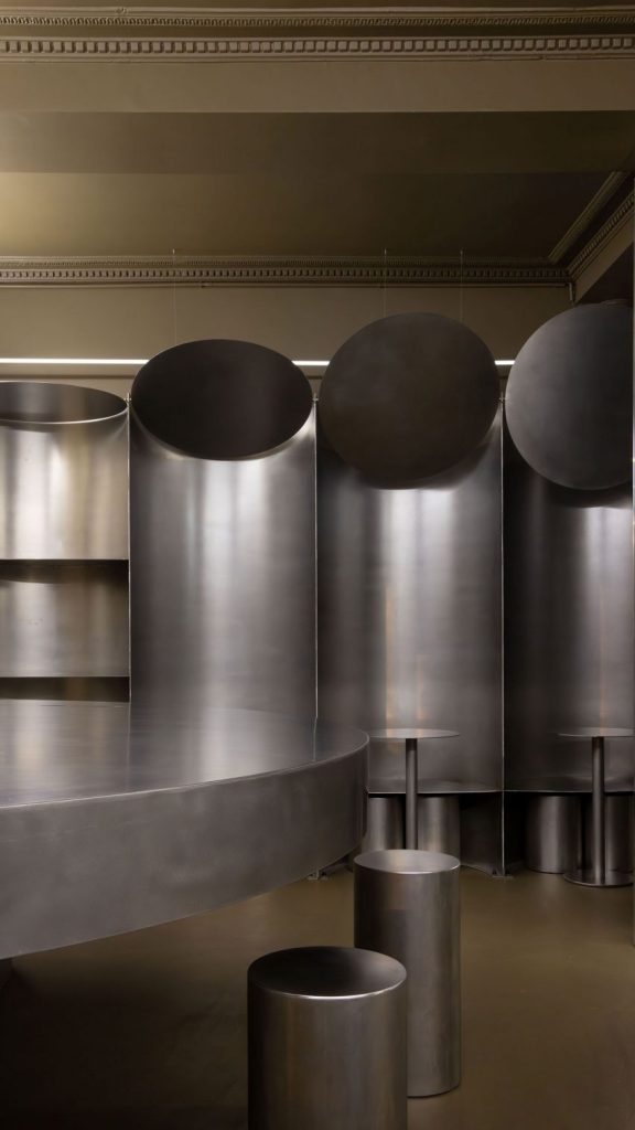 Simple Coffee by Mur Mur Architectes demonstrates how a small footprint can yield architectural intensity. Stainless steel surfaces curve around a central bar, forming reflective alcoves that recall industrial silos.