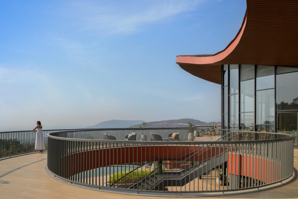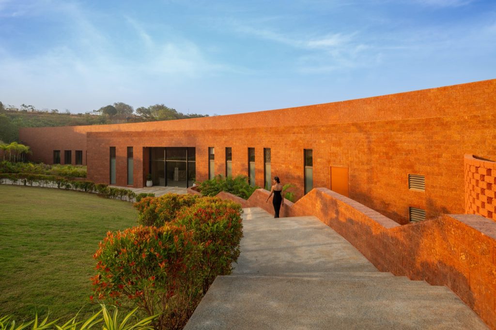Set on a steep coastal hillside in Anjarle, Maharashtra, Crest Nine is conceived as a recreational community centre serving a gated villa enclave overlooking the Arabian Sea. Designed by Sanjay Puri Architects, the project responds directly to the dramatic topography of the site, where the terrain drops sharply from the approach road toward the ocean.