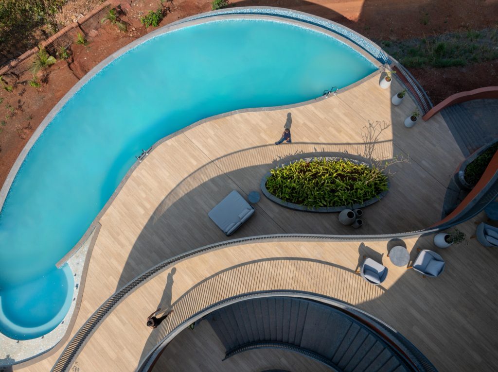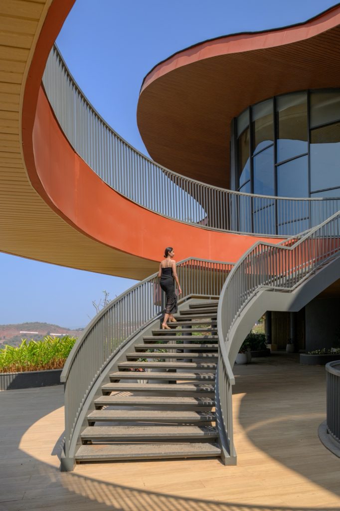 Above, a sectionally curved roof undulates across the building. The roof rises prominently above the primary volumes and dips between them, shaping a series of intimate courtyard spaces. Deep overhangs extend beyond the decks, offering protection from the intense sun and seasonal monsoon rains while reinforcing the building’s sculptural presence.