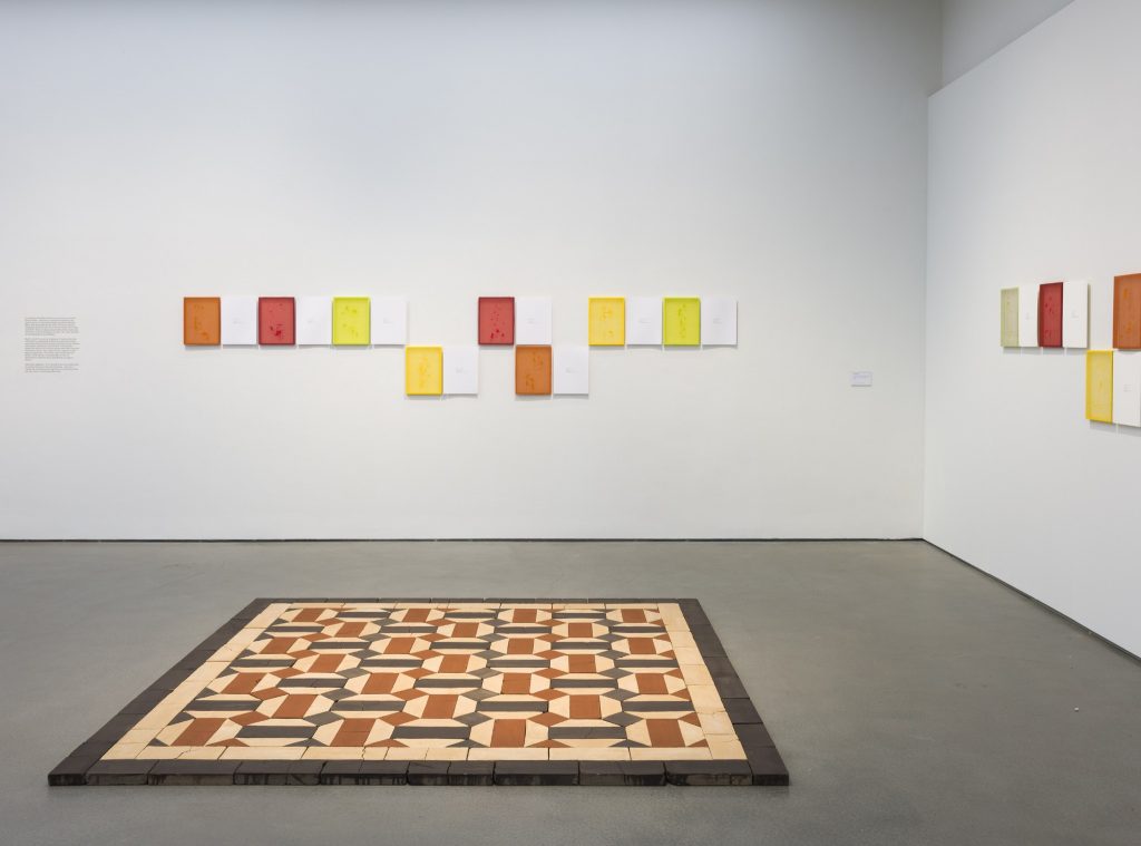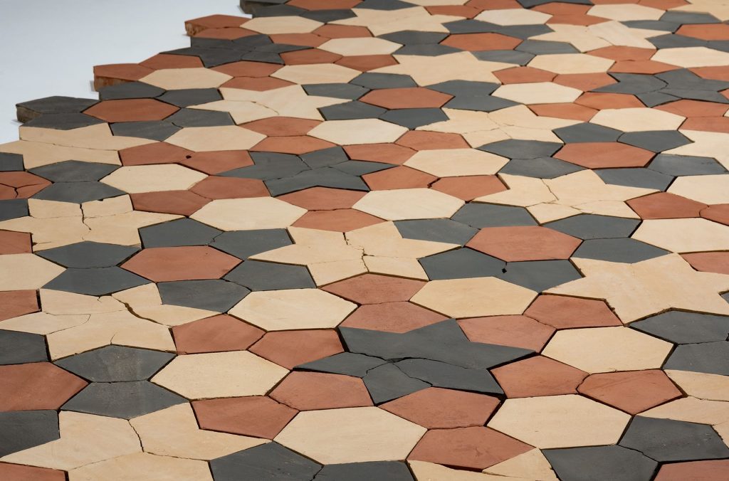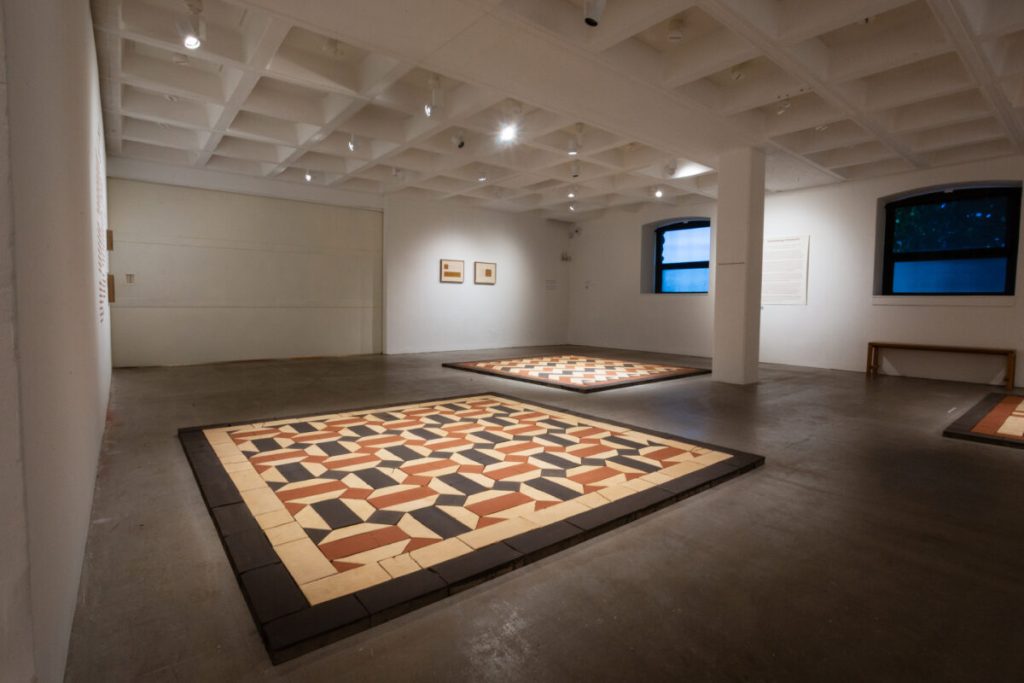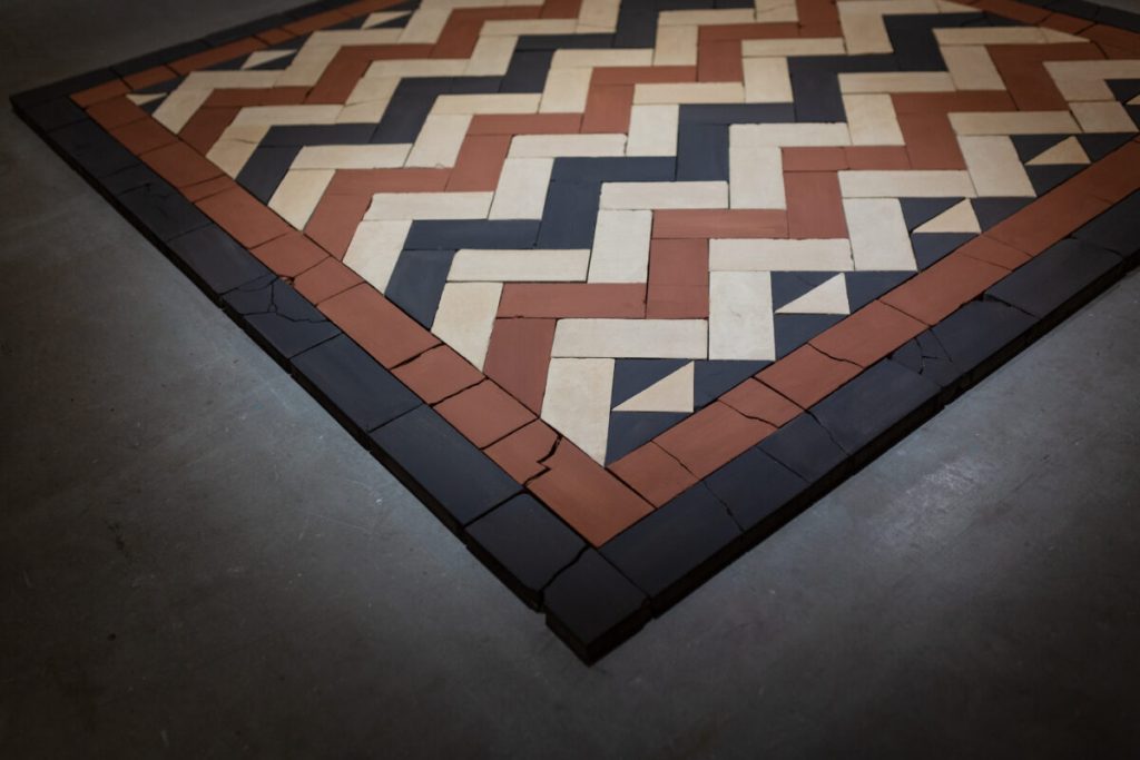 At the centre of the exhibition is Standing by the Ruins III (2025), a monumental floor installation composed of hundreds of handmade adobe bricks in a restrained palette of earthen whites, ochres, and deep greys. The work reconstructs a geometric pattern from the floor of Hamam al Sammara in Gaza, a historic bathhouse dating to the Mamluk period and now believed to have been destroyed in late 2023.