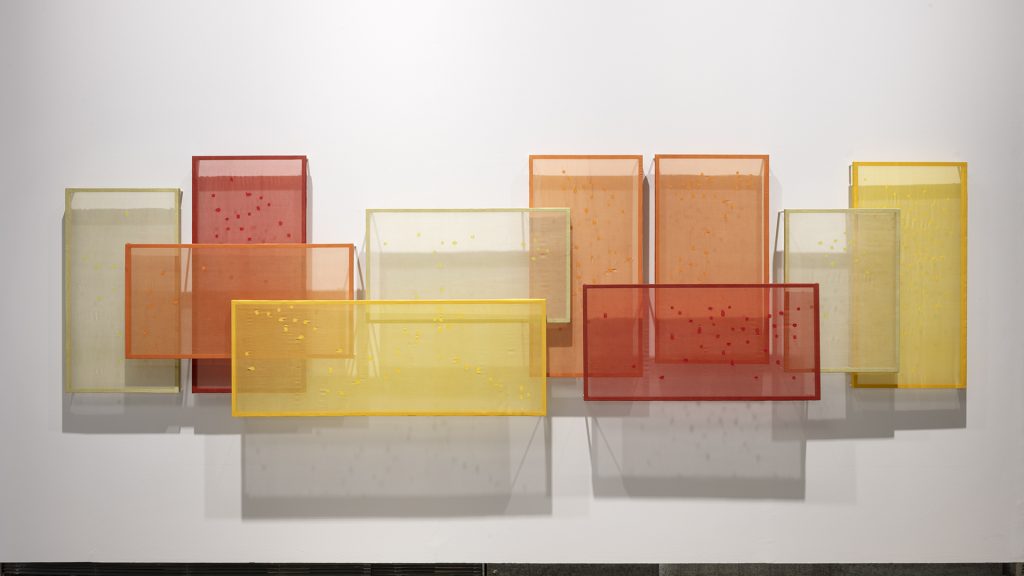 If Standing by the Ruins III addresses destruction through ground and fracture, other works in the exhibition treat repair as a durational practice. One of the most affecting bodies of work, Come, Let Me Heal Your Wounds. Let Me Mend Your Broken Bones (2019 to 2024, expanded iterations), transforms dyed silk panels into a cartography of damaged and destroyed heritage sites across parts of the Middle East. Awartani tears the textile at points corresponding to specific locations of loss, then mends these ruptures using traditional darning techniques. The repairs are not concealed. They read as scars, as sutures, as evidence of an encounter that cannot be undone.