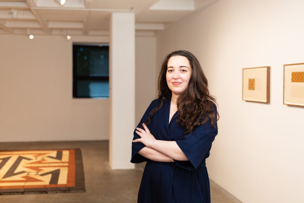 Installation view of Dana Awartani’s Standing by the Ruins at Arnolfini, Bristol, 2025, featuring the monumental floor work Standing by the Ruins III. Credit: © Dana Awartani; Courtesy the artist and Arnolfini. Photography by Lisa Whiting.