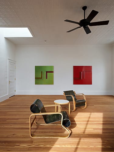 Upper level room in Donald Judd’s Marfa Architecture Office, with plywood furniture and integrated artworks in a disciplined space. Credit: Matthew Millman © Judd Foundation.