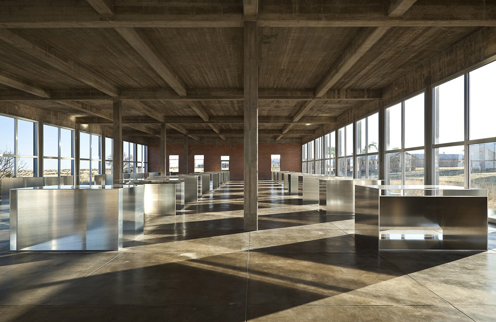 Installation view of 100 untitled works in mill aluminum (1982–1986) in the Chinati Foundation artillery sheds, with natural light gradients. Credit: Douglas Tuck © Judd Foundation.