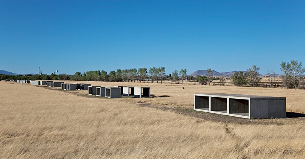 15 untitled works in concrete (1980–1984) aligned in the vast Marfa desert landscape at Chinati Foundation. Credit: © Judd Foundation.